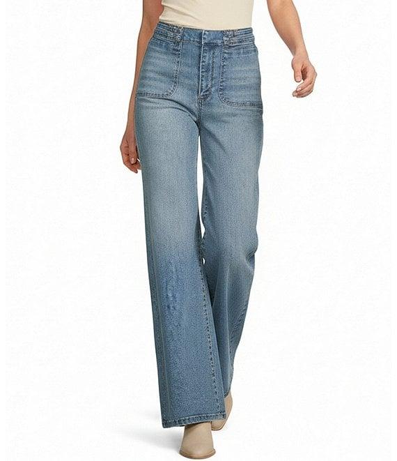 From A Loves A, these jeans feature: Denim fabrication Stretch construction High rise waistline Dual front quarter top patch pockets Dual back patch pocket Front zipper placket with hook & bar closure Lattice belted for styling Wide leg silhouette Full length Classic fit Approx. 32.5" inseam Cotton/polyester/rayon/spandex Machine wash on cold cycle, wash with similar fabrications, wash with similar colors, use non-chlorinated bleach if needed, promptly remove from wash, tumble dry on low, promptly remove from dryer, use cool iron on low if needed Imported.