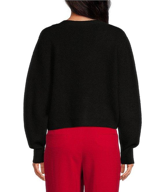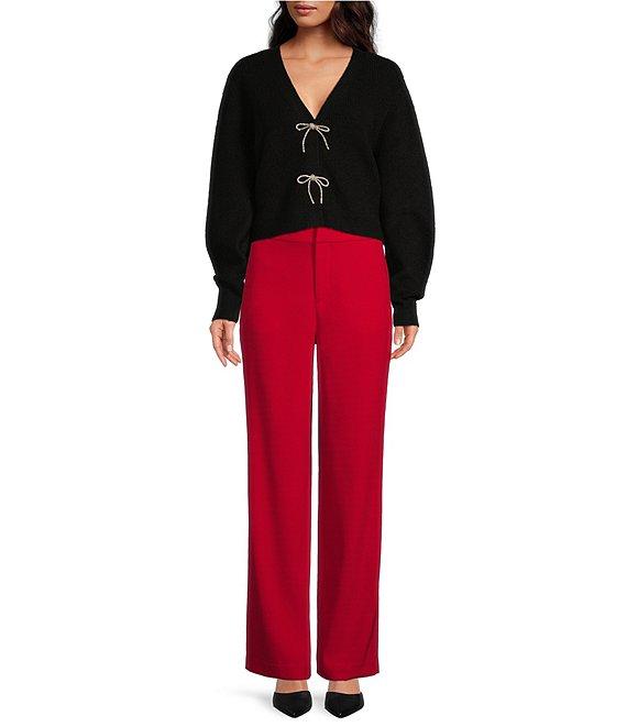 From A Loves A, this sweater features: Wool Blend Sweater Knit Fabrication Cardigan Silhouette Detachable Rhinestone Bow Snaps V-neckline Long Sleeves with Ribbed Cuffs Modern Fit Cropped Length Straight Hemline Snap Front Closure Approx. 20" in length Polyester/acrylic/wool/spandex Remove Rhinestone Bow Attachments from snaps and secure snaps prior to wash, turn garment inside out, machine wash on cool cycle, promptly remove from wash, lay flat to dry and reshape. Imported. Dillard's Exclusive