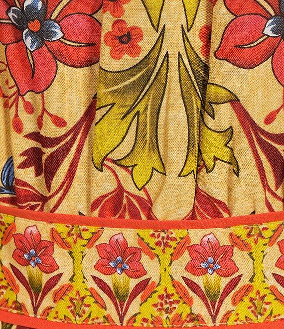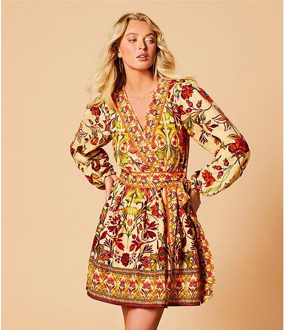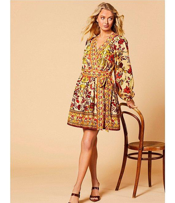 From A Loves A, this dress features: Floral print Boarder placement print detail Woven fabrication Surplice v-neckline Front tie at side closure Pull through construction Long bubble sleeve Elastic cuff A-line silhouette Fully lined Flounce hemline Above the knee length Approx. 36.5" HPS in length Shell: linen/rayon Lining: cotton Machine wash on cold cycle, wash with similar colors and fabrications, hang on line to dry, use cool steam iron if needed. Imported. Dillard's Exclusive