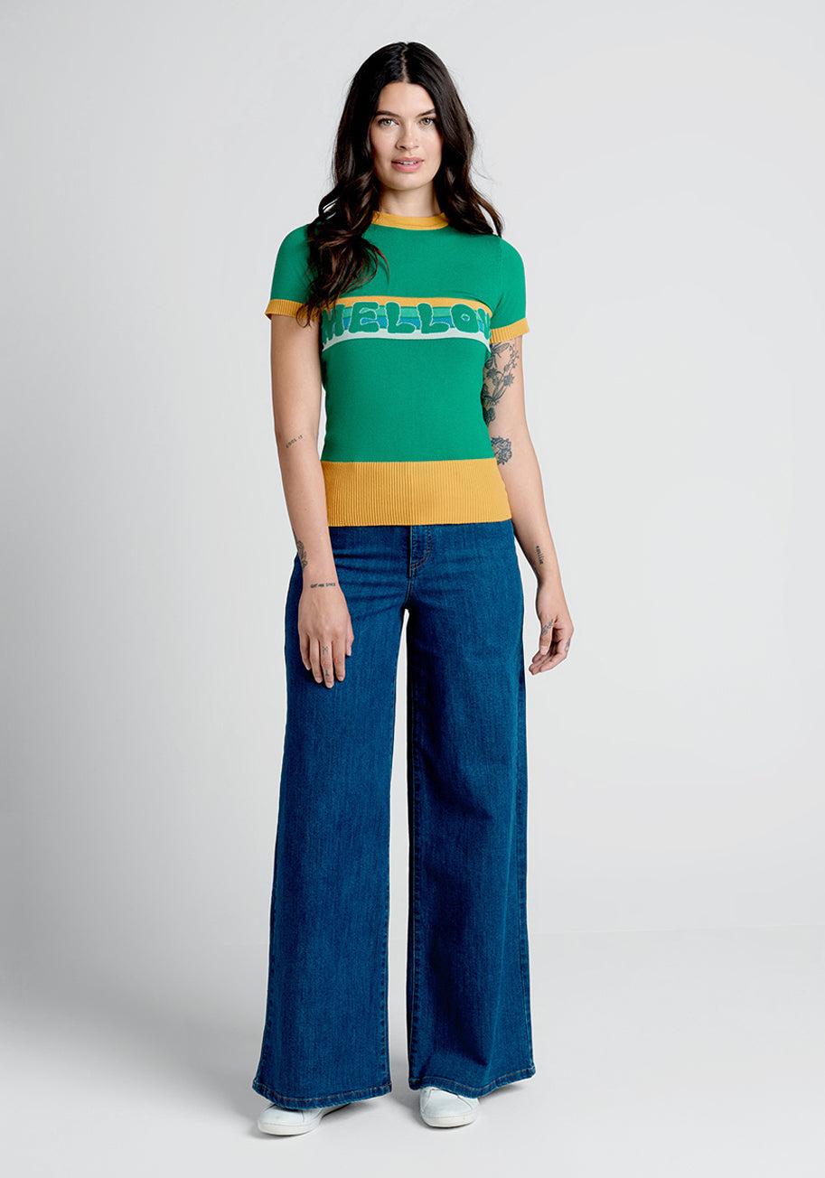 Say hello to this retro-inspired knit top from UK brand Bright and Beautiful! Made from a viscose-blend knit, this short sleeve green sweater boasts stripe detailing at the front in shades of yellow, blue, teal, and white beneath groovy green bubble letters that read, “Mellow.” So 70’s-inspired and truly unique, this causal knit tee boasts short sleeves and yellow ribbed-knit detailing at the crew neck, cuffs, and wide hemline. PLEASE NOTE: UK brands have their own sizing, so be sure to check the sizing chart carefully to find your perfect fit! 70% Viscose, 30% Nylon. Machine wash. Imported Runs true to size. Fabric provides stretch. XS/S=22.5 inches length.