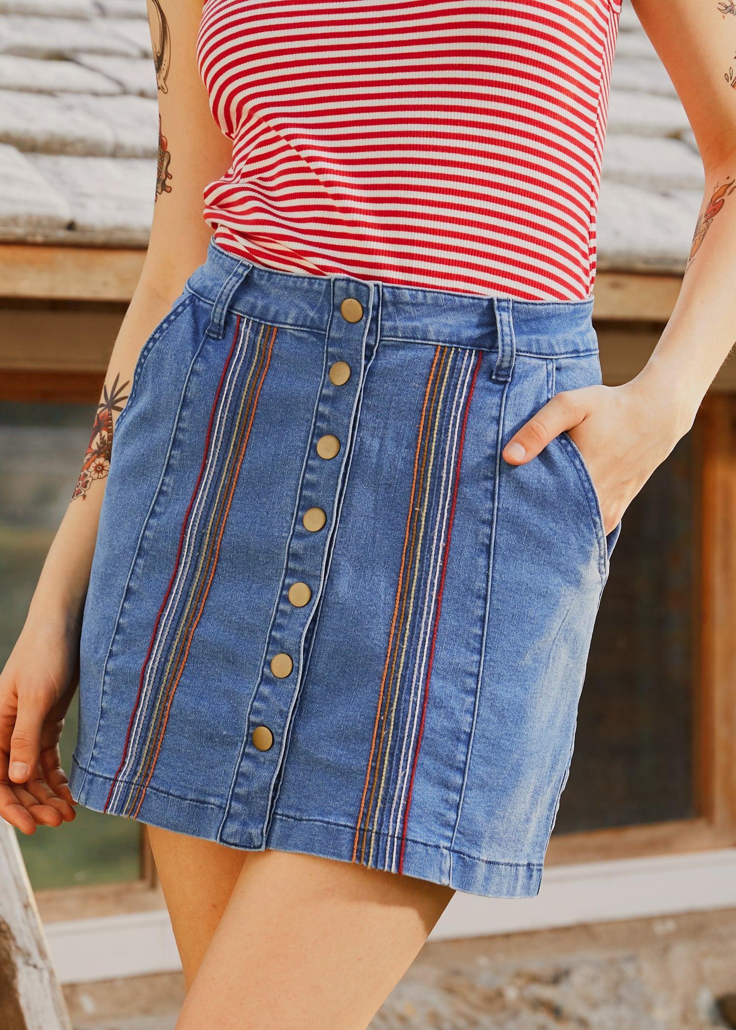 Embrace the season's charm with the Faded Sky Medium Wash A-Line Skirt, a treasured piece from our ModCloth namesake label. This skirt captures the essence of springtime adventures with its soft, denim-like fabric and eye-catching vertical rainbow stitch detailing at the front. The button-up front lends a vintage vibe while ensuring functionality and ease of wear. Designed with belt loops, it invites you to accessorize with your favorite belt for an added touch of personality. Machine wash cold 70% Cotton, 28% Polyester, 2% Spandex Length 16" Imported Model is wearing a US size S Model Measurements: Height 5'6"/Bust 36"/Waist 27"/Hips 40"