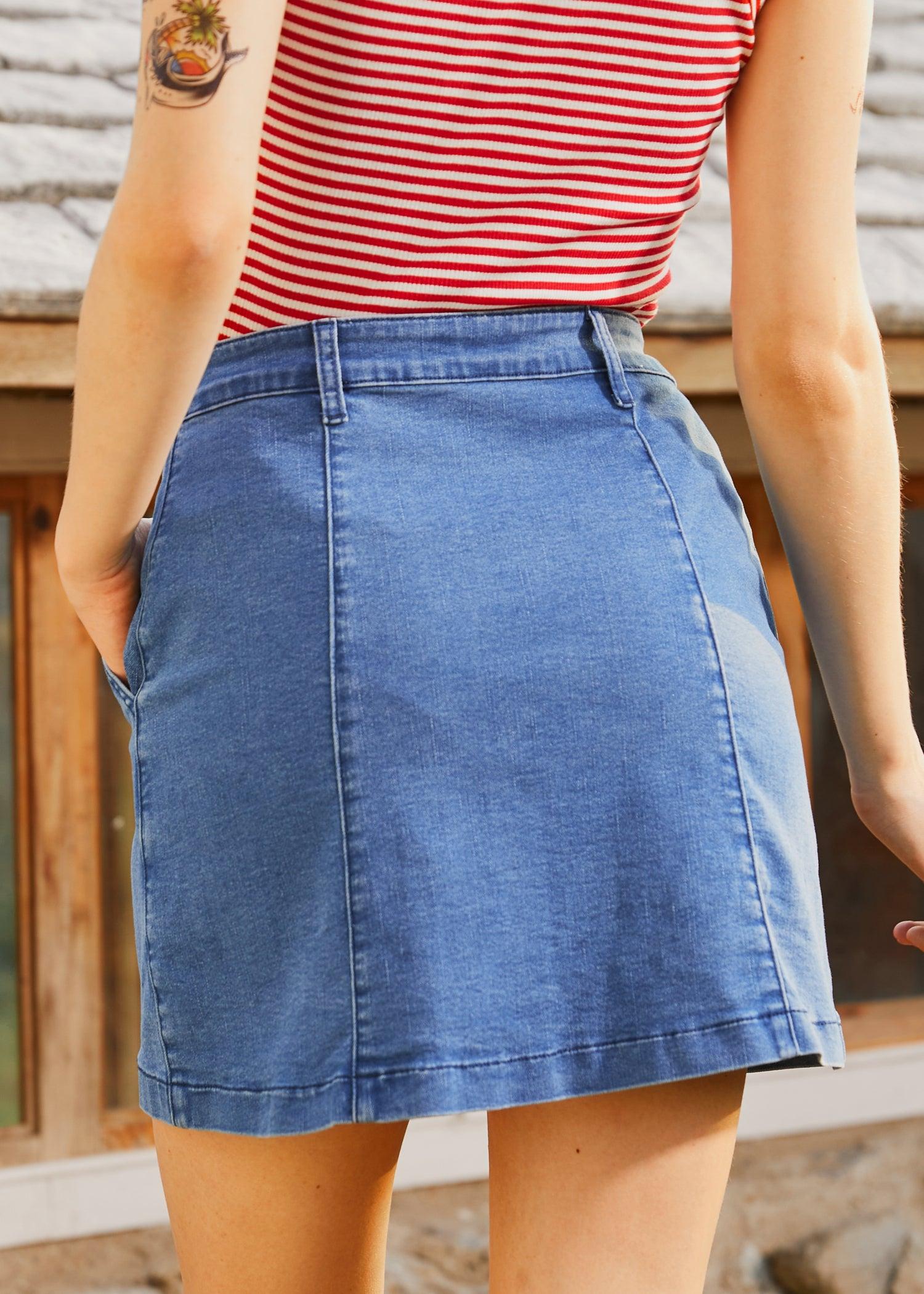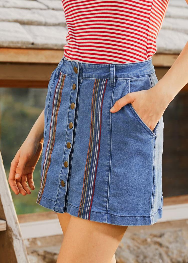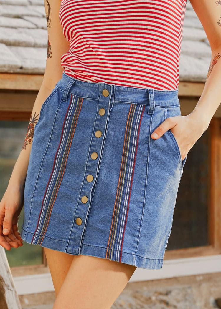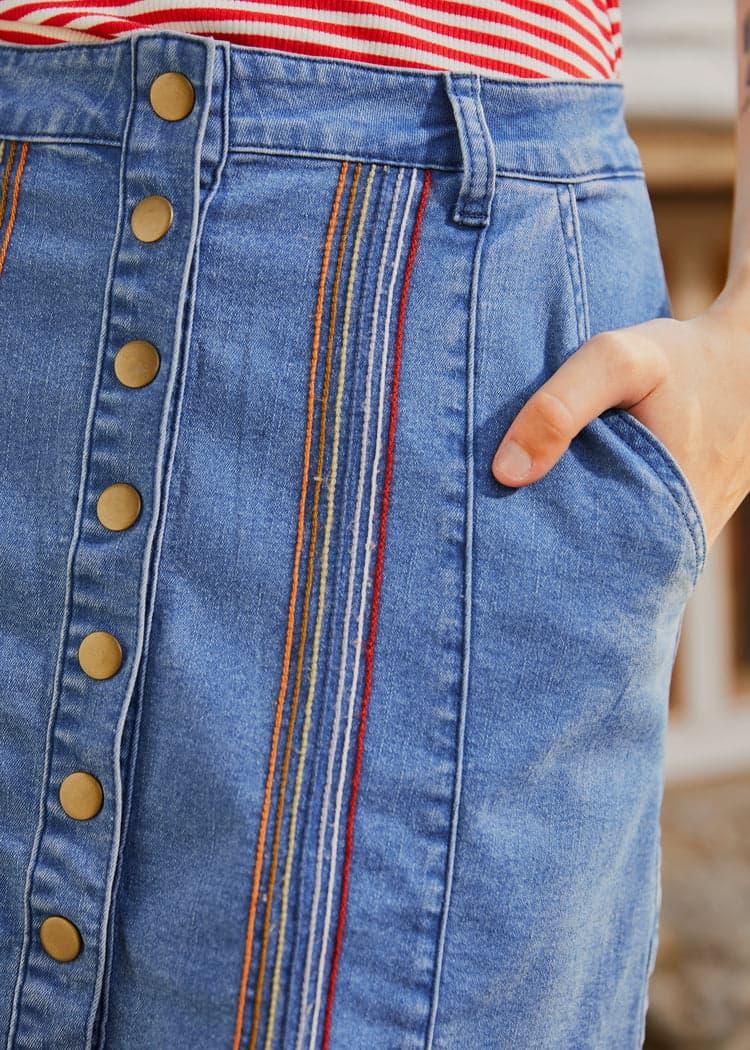 Embrace the season's charm with the Faded Sky Medium Wash A-Line Skirt, a treasured piece from our ModCloth namesake label. This skirt captures the essence of springtime adventures with its soft, denim-like fabric and eye-catching vertical rainbow stitch detailing at the front. The button-up front lends a vintage vibe while ensuring functionality and ease of wear. Designed with belt loops, it invites you to accessorize with your favorite belt for an added touch of personality.Machine wash cold70% Cotton, 28% Polyester, 2% SpandexLength 16"ImportedModel is wearing a US size SModel Measurements: Height 5'6"/Bust 36"/Waist 27"/Hips 40"