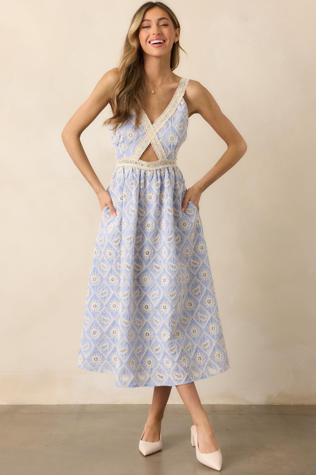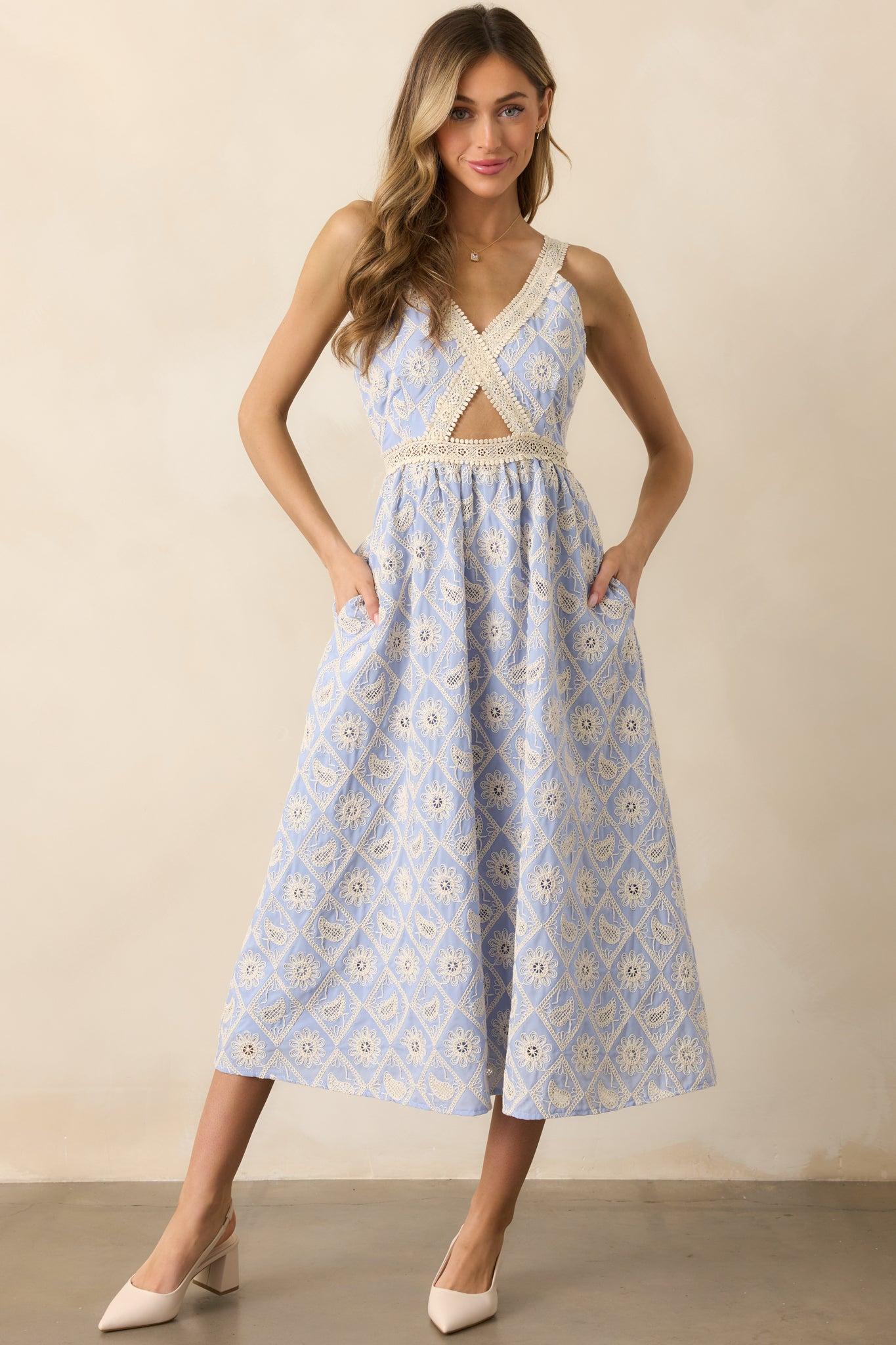Turn heads in our A Touch Of Grace Periwinkle Embroidered Cutout Midi Dress. Perfect for elegant dinners, rooftop gatherings, or exploring refined venues, this dress exudes sophistication with every step. Its intricate details and graceful design ensure you’ll leave a lasting impression wherever the moment takes you. This periwinkle dress features lace embroidery detailing throughout, a v-neckline, a cutout in the center of the bodice, and adjustable straps.