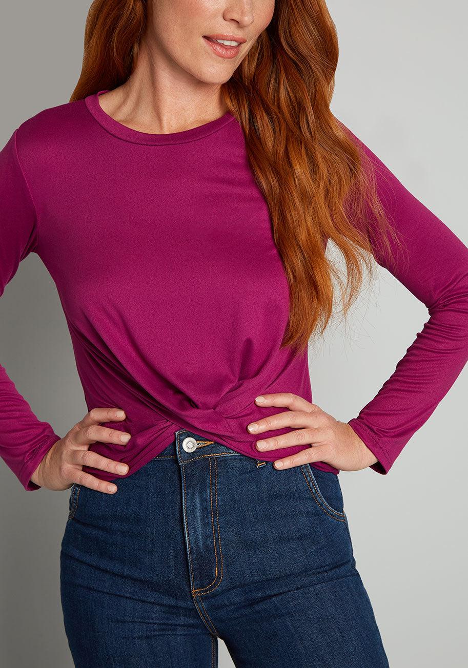 We all need a little sprucing up in our knitwear department, and what better way to refresh yours than with this raspberry-hued long sleeve top from our ModCloth namesake label. Made from a super soft, stretchy knit, this subtly cropped long sleeve tee features a chic gathered twist-knot detail at the front hem, making this an elevated basic that can be styled and layered in a multitude of ways. So versatile and effortlessly stylish, this crew neck top will surely become one of your favorite go-to pieces. 95% Polyester, 5% Spandex Machine wash Made in the United States Runs true to size Fabric provides stretch S=19 in. length 1X=21 in. length
