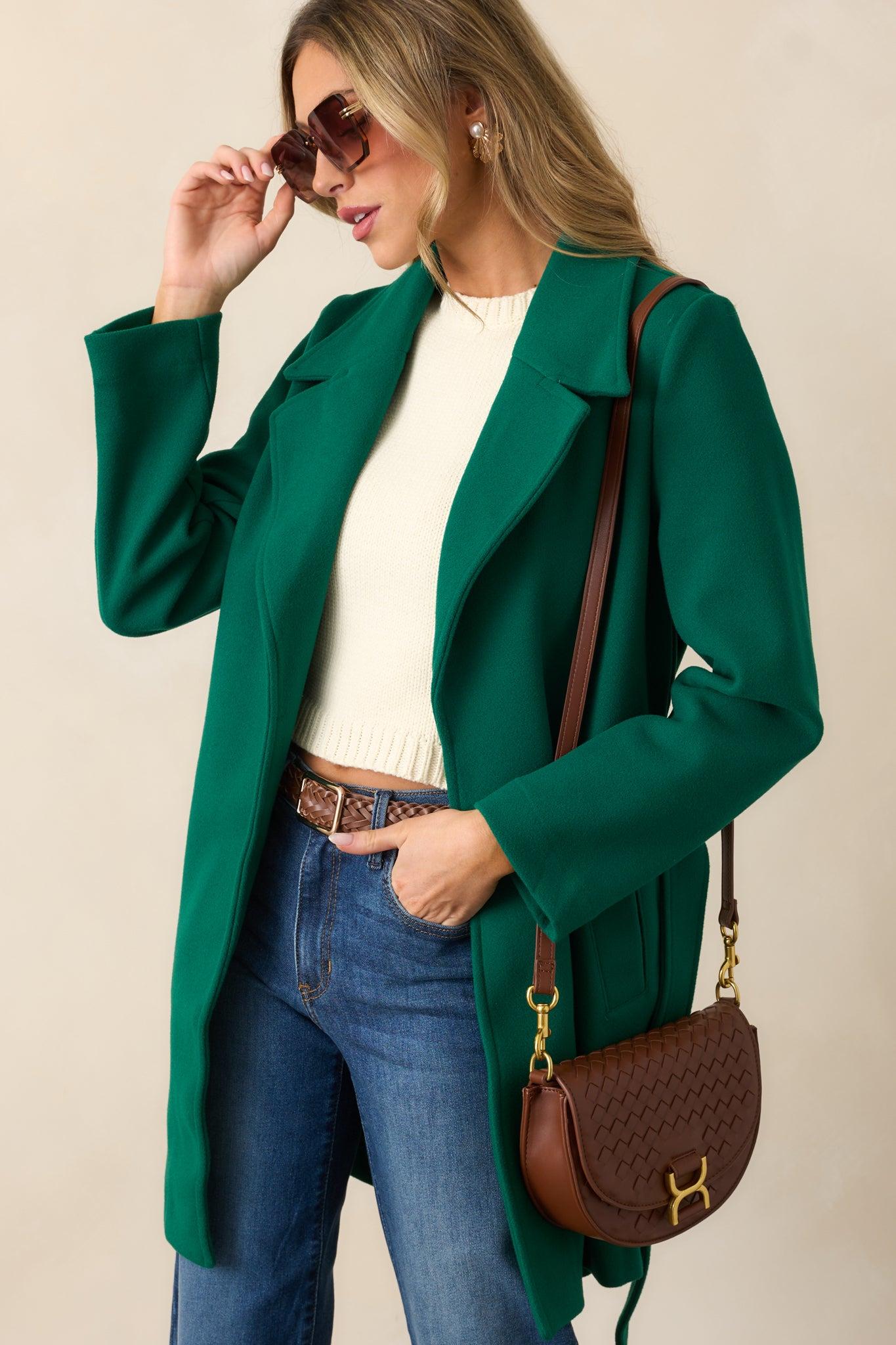 Experience the city in style with our A Walk Through The City Kelly Green Coat! The vibrant color and sleek design will make you stand out while keeping you warm. Perfect for any occasion, this coat is a must-have for any fashion-forward individual. Elevate your wardrobe today! This kelly green coat features a double breasted design, self-tie waistband, and long sleeves. 100% Polyester Unlined Hand Wash Cold Manufactured in China Designed in The USA Model is 5'8" and is wearing a size small