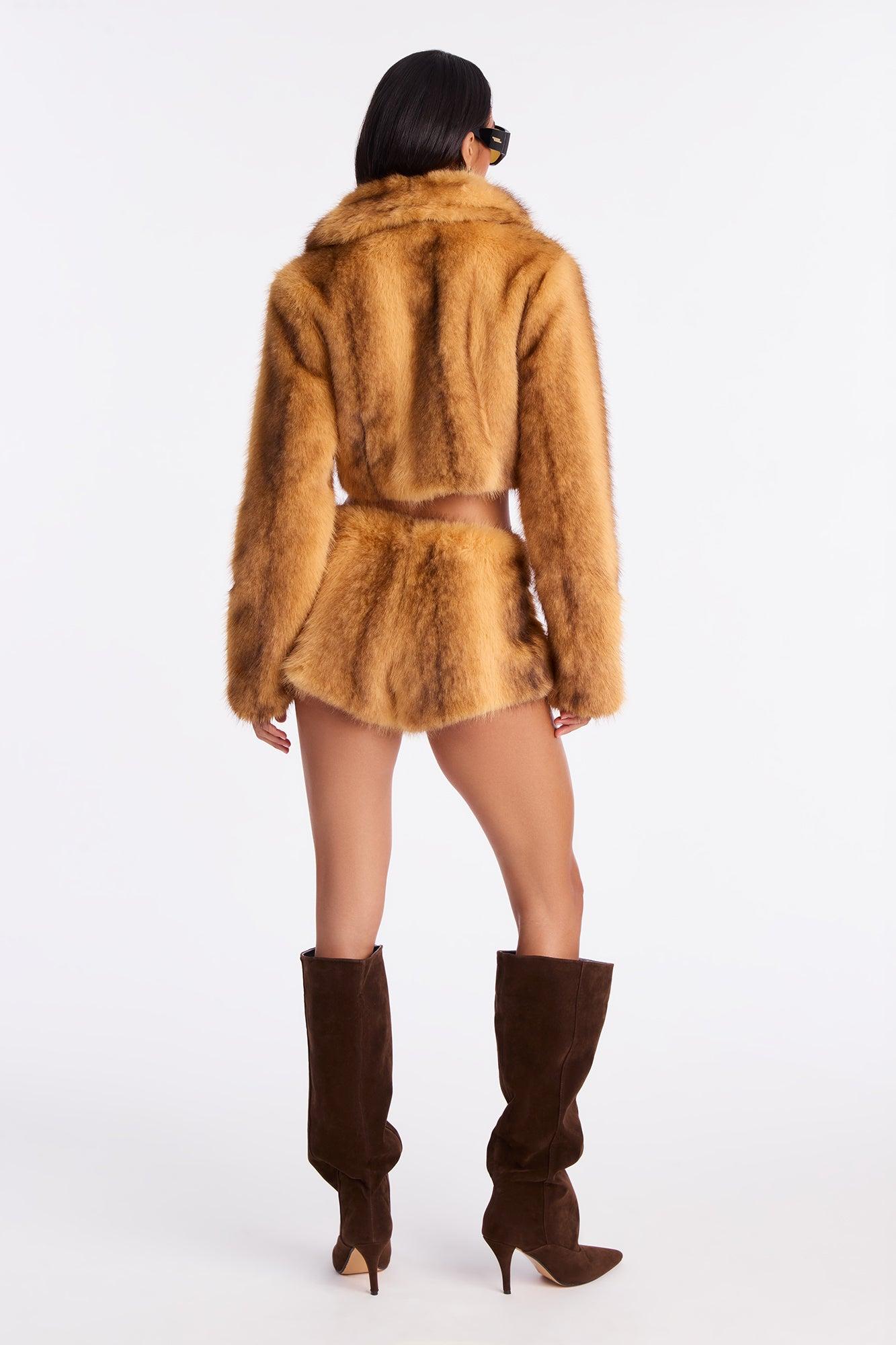 Available In Camel. Jacket Collar Long Sleeve Faux Fur Button Snap Closure Cropped Pair with "A Whole Mood Faux Fur Micro Short" Self Faux Fur: 100% Polyester Lining: 100% Polyester Imported California Proposition 65WARNING: Cancer and Reproductive Harm - www.P65Warnings.ca.gov.