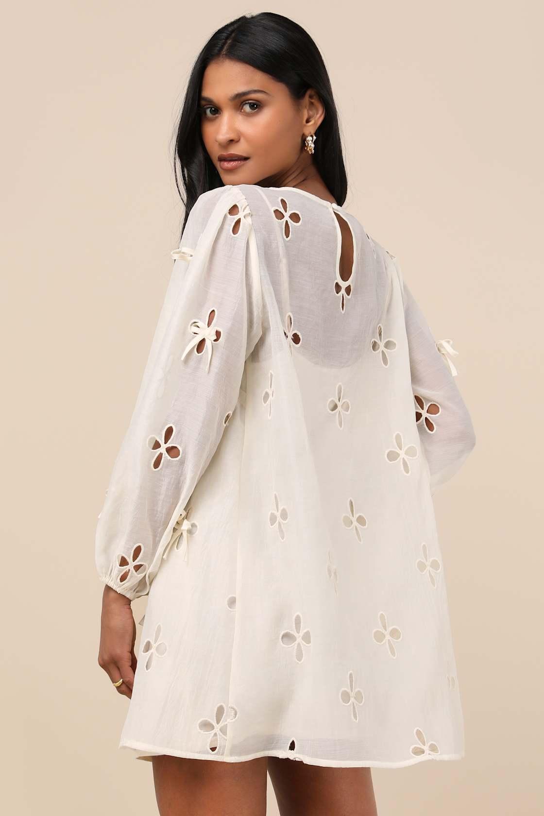 Prepare for the sweetest treatment when you head out in the Lulus Aamira Cream Embroidered Bow Blouson Sleeve Shift Mini Dress! Sheer, lightweight woven fabric (atop a matching liner) features an embroidered, pierced design and cute bow details across the front of this adorable mini dress. A scoop neckline sits atop the relaxed, shift-style silhouette, all framed by blouson sleeves with puff shoulders and elasticized cuffs. Top button closure secures the keyhole cutout at back.