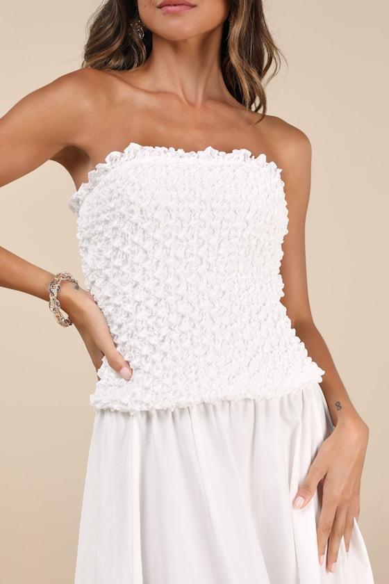 Sway through the day like a dream in this gorgeous Rare London dress that falls from an intricately textured strapless bodice with a cute ruffled neckline. The drop-waist silhouette flows into a cotton skirt with a full, A-line cut and a timeless midi hem worthy of a twirl or two. Hidden no-slip strips and hidden zipper/clasp at back.