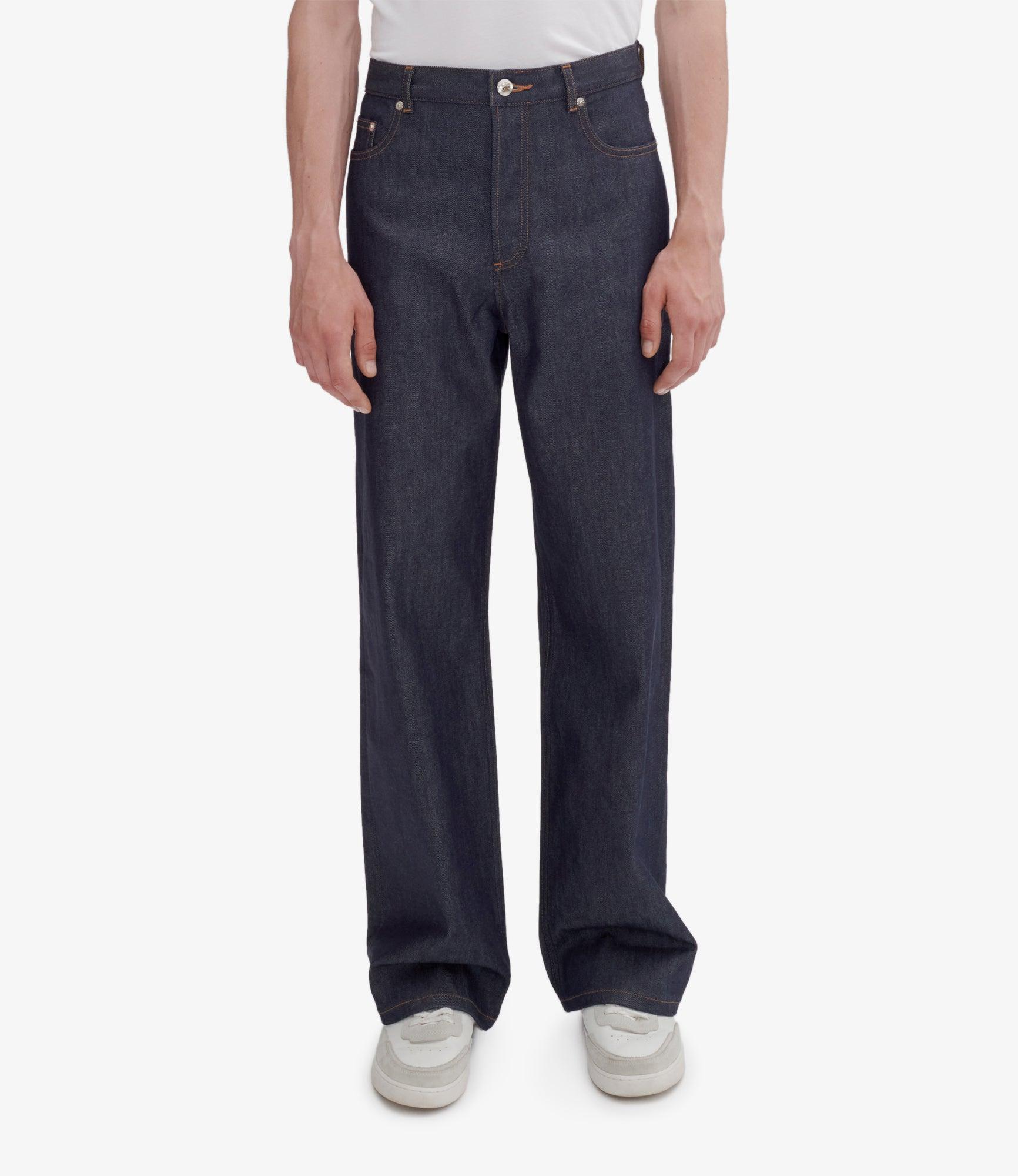 A.P.C. Men's jean. - Fabric has stretch but is still stiffer than usual denim jeans.- Very wide and loose fit. - Size down at least 1 size for regular fit.- High rise.- Button fly. - Caramel-colored topstitching.