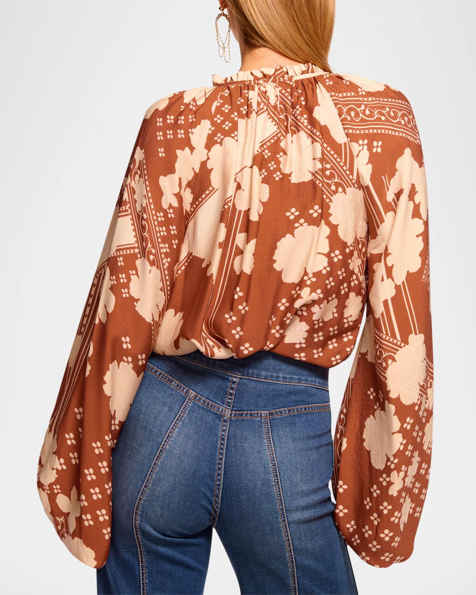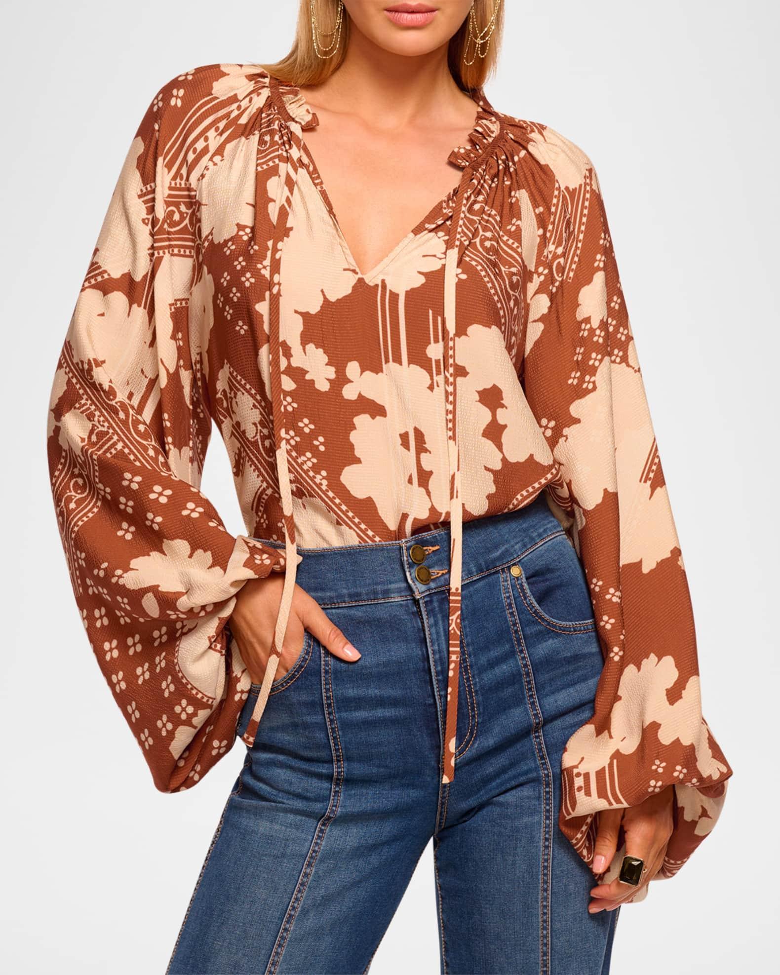 Offered in a multi-pattern floral print, the Aaron blouse by Ramy Brook is framed with voluminous sleeves Approx. 25"L from shoulder to hem V neckline with optional self-ties Long balloon sleeves; elastic cuffs Relaxed fit Hip length Slipover style Rayon/cellulose acetate Dry clean Imported