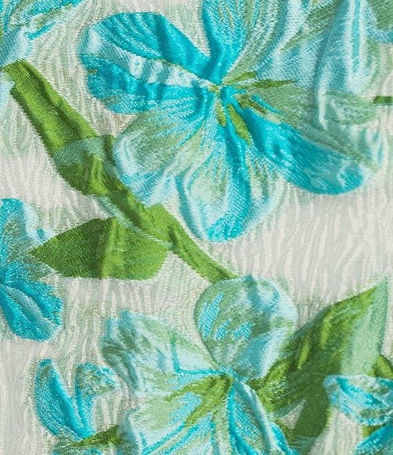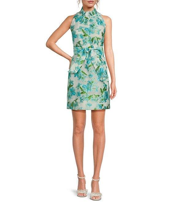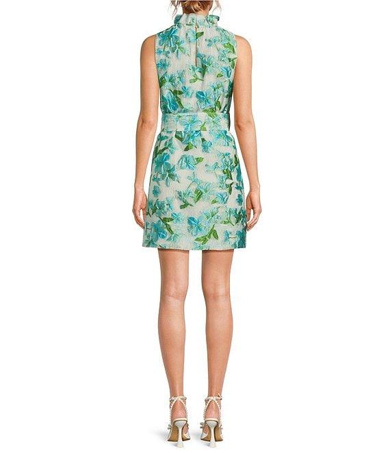 From Abbey Glass, this dress features: Floral print Shift silhouette Ruffle mock neckline Sleeveless Detachable self tie belt Pull on over-the head construction Relaxed fit Fully lined Back button loop closure Approx. 37" in length Polyester Dry clean or hand wash Imported.