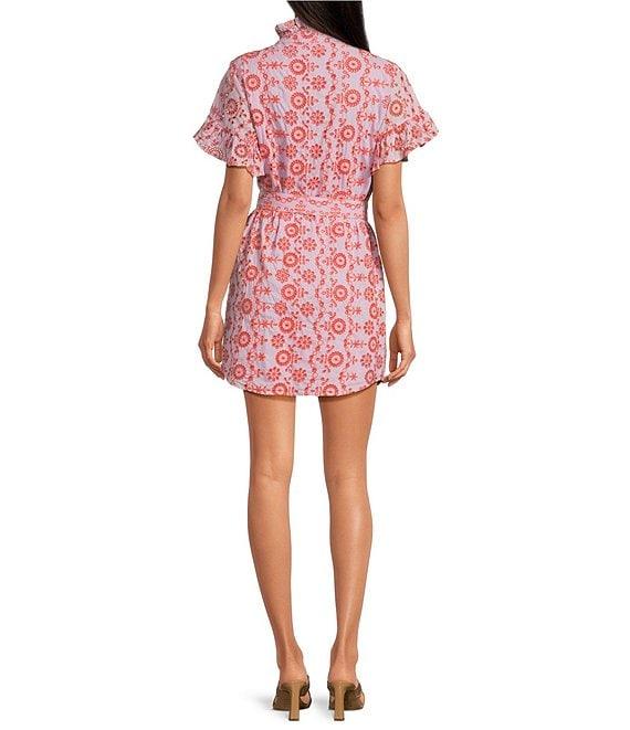 From Abbey Glass, this top features: Eyelet fabricationButton down collarShort sleeves with ruffle detailFront closure with covered buttonsSelf-tie belt at waistMini lengthFully linedApprox. 35" in length from shoulder to hemCottonMachine or hand wash cold, gentle cycle, and hang dry recommendedImported.