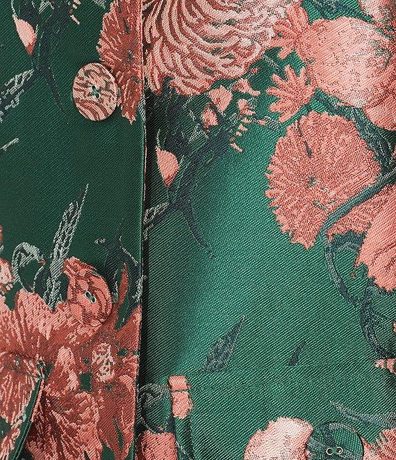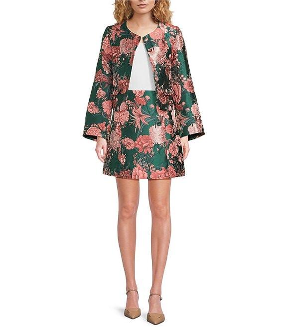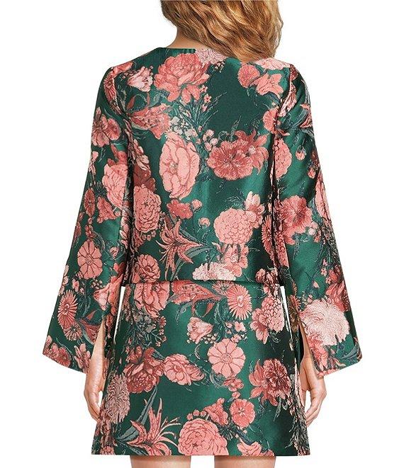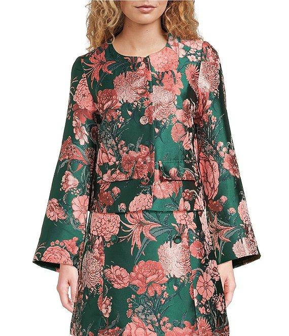 From Abbey Glass, this jacket features: Jacquard fabrication Floral print Round neckline Bell sleeves Detailed trim 4-button closure Faux front pockets Approx. 21" in length from neck to hem Polyester Handwash or professionally dry clean only Imported.