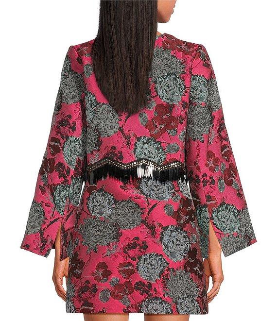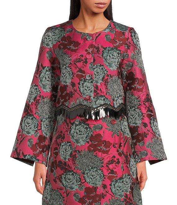 From Abbey Glass, this jacket features: Jacquard fabrication Floral print Round neckline Long bell sleeves Detailed trim 4-Button closure Faux front pockets Approx. 21" in length from neck to hem Polyester Handwash or professionally dry clean only Imported.