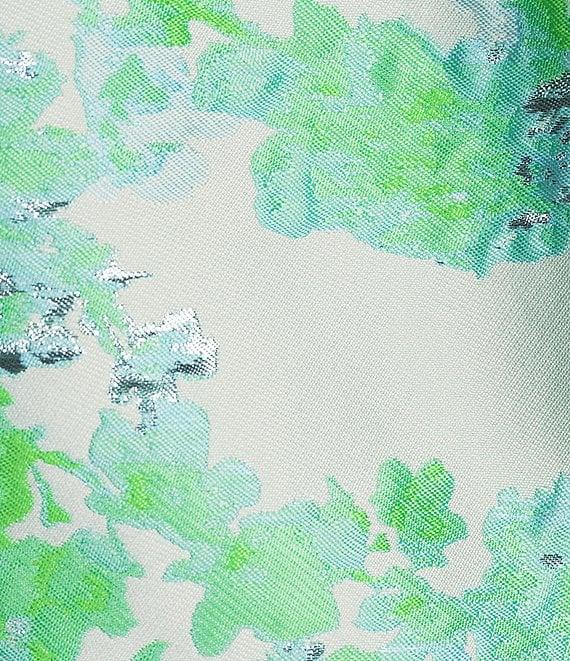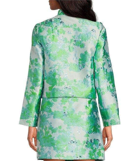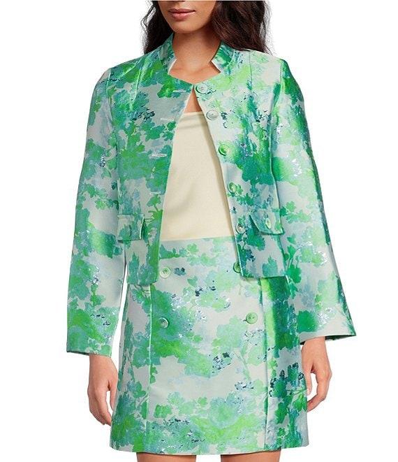 From Abbey Glass, this jacket features: Metallic Brocade Floral Print Notched Neckline Long Sleeves 4-Button Closure Faux Front Pockets Approx. 21" in Length Polyester Handwash or Professionally Dry Clean Only Imported.