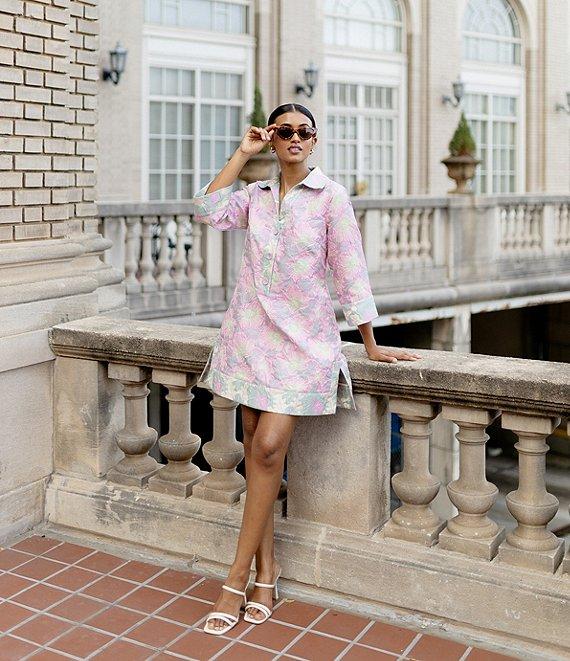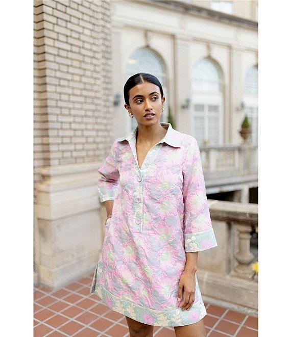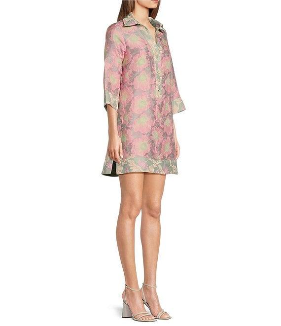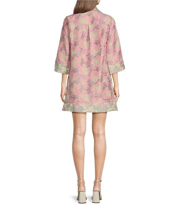 From Abbey Glass, this dress features:Synthetic blend jacquard fabrication Collared with covered buttons and contrast trim3/4 sleevesSide seam pocketsUnlinedPullover constructionApprox. 34" in length from shoulder to hem PolyesterDry clean Imported.