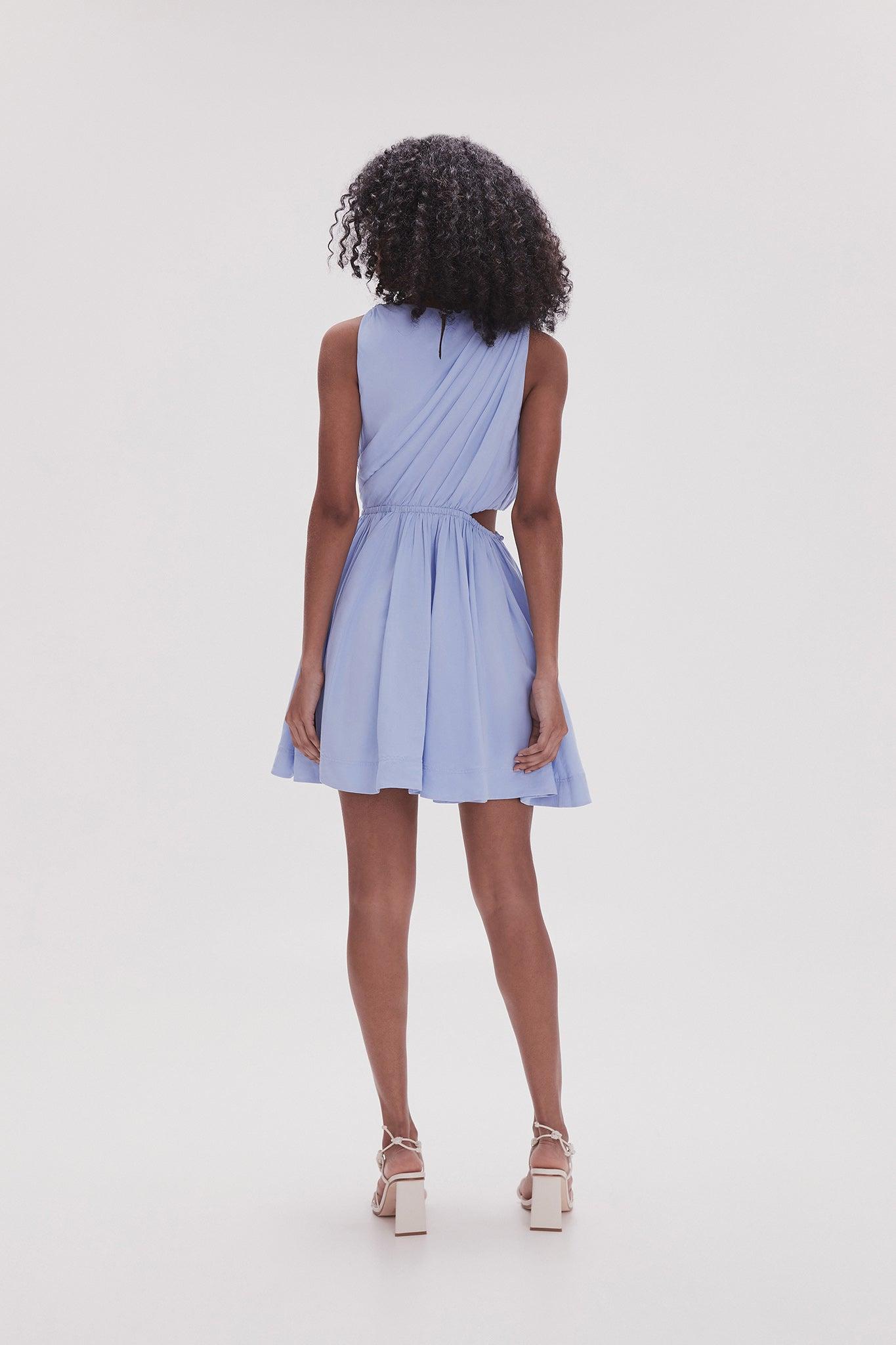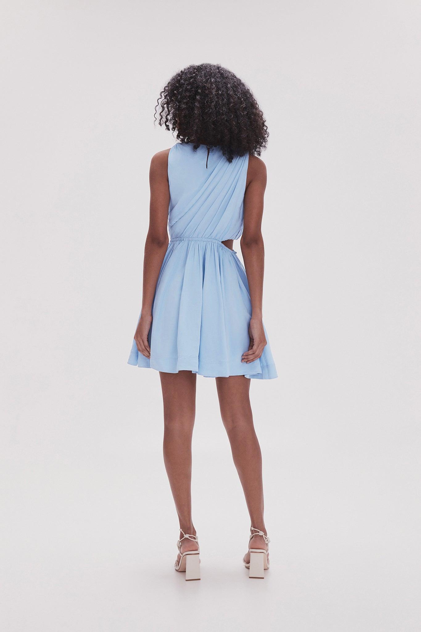 PRODUCT DETAILS Women’s mini dress High neckline Heavy stitch detailing Twisted left-hand shoulder detail Bodice and shoulder draping Angled waist cut out Drawcord waist belt Full mini skirt with gathers Side pockets Zip, hook and eye closure Lined Shop All Dresses SIZE AND FIT Model wears a size AU 8/S Model: 179cm/ 5’10 Bust: 85cm Waist: 60cm Hips: 90cm FABRICATION 70% Rayon 30% Linen Dry Clean only