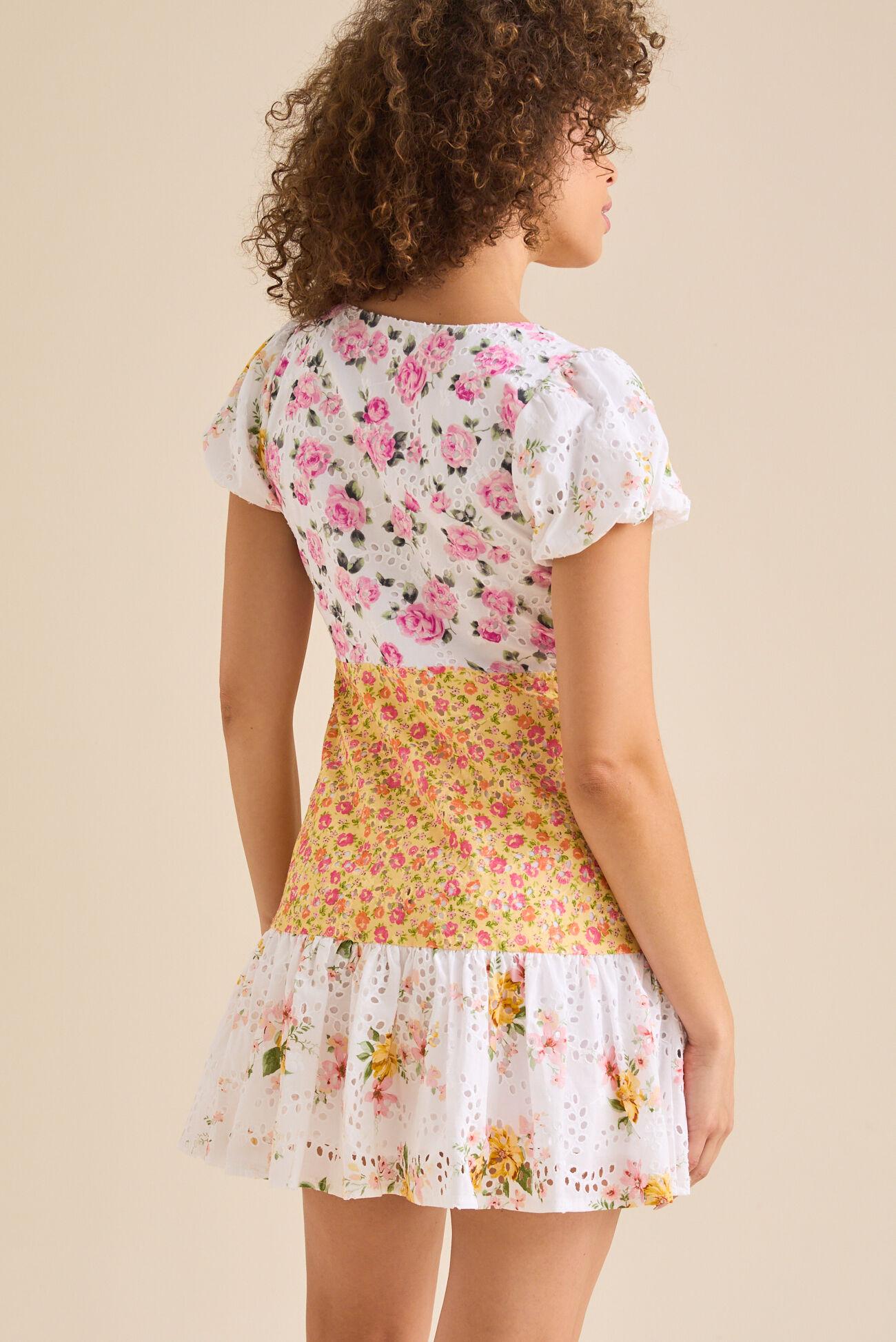 The Abby Floral Mini Dress is a warm-weather must-have with its flattering fit-and-flare silhouette, delicate floral eyelet pattern, and lace trim for a timeless, feminine touch.