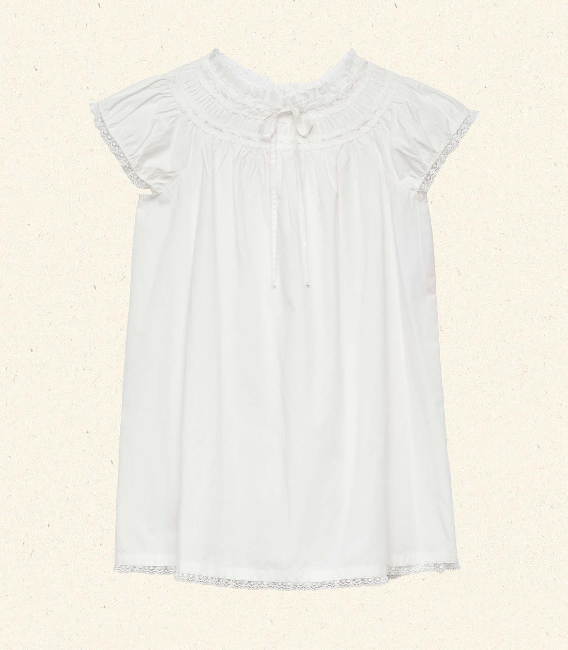 In crisp organic cotton poplin, the Abelle Dress features a breezy silhouette with short puffed sleeves and a full skirt that falls just above the knee. Floral scallop lace, pintucks, and a grosgrain ribbon tie adorn the yoke and neckline, while scallop edge lace trims the sleeve cuffs and hem. Three petite buttons fasten at the back neck.