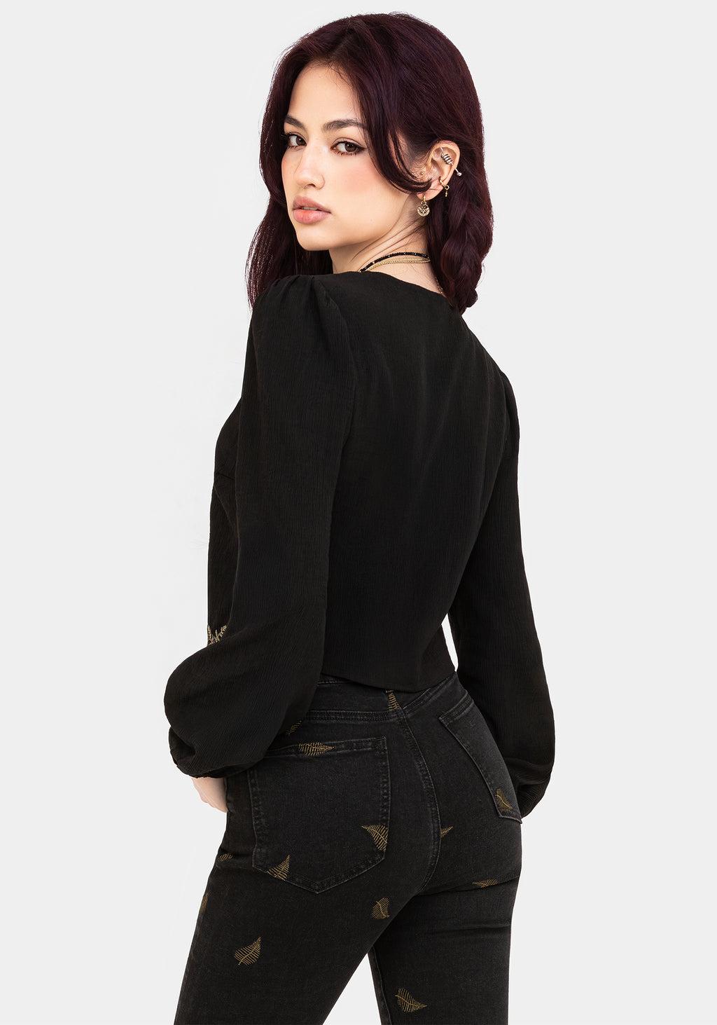 Black Embroidered Blouse Moon & Fern Embroidery Long, Elasticated Cuff Blouson Sleeves V-Neckline Cropped Fit Self-Fabric Tie 85% Viscose, 15% Polyamide Vika is 5'5" and is wearing a UK6 / US2