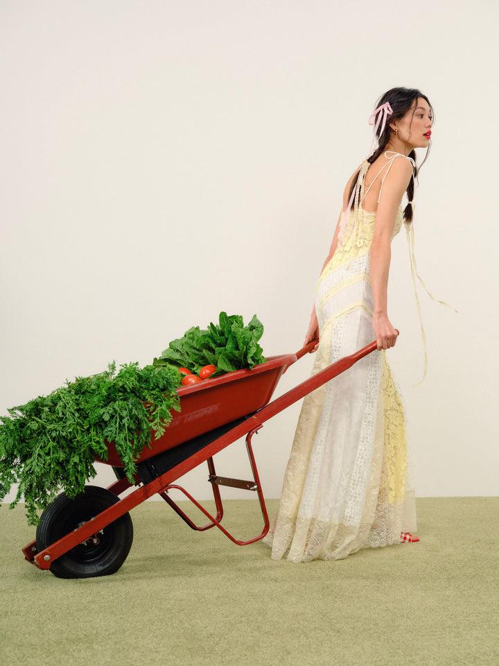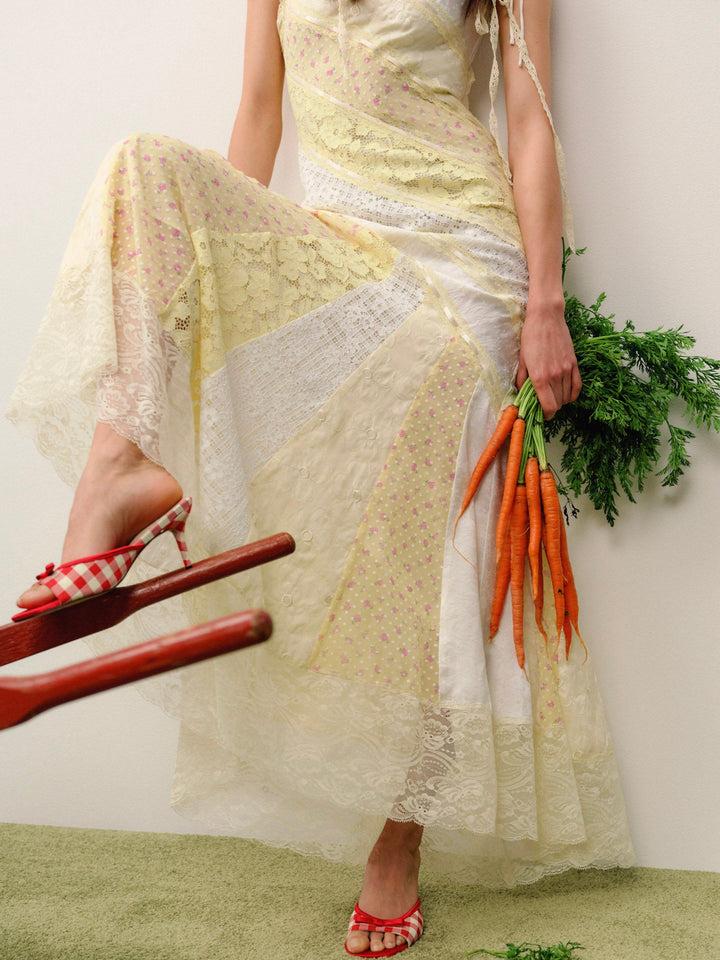 FOR LOVE & LEMONS KEEPSAKES: Inspired by heirloom vintage gowns, the Abigail yellow lace dress possesses an exquisite old-time charm. This patchwork dress is cut on the bias for a flattering silhouette, crafted with an intricate paneled mixed lace and floral fabrication, and adorned with delicate slotted lace and ribbon trims.