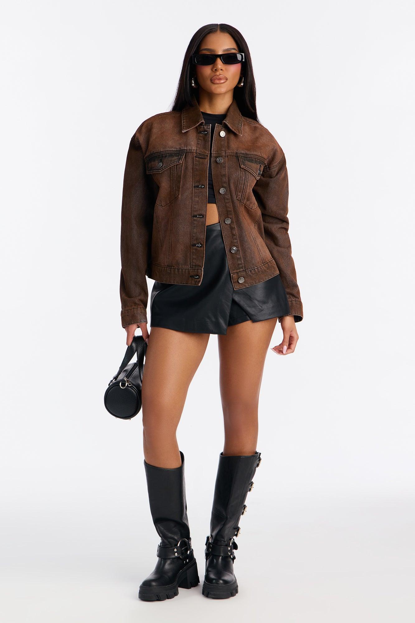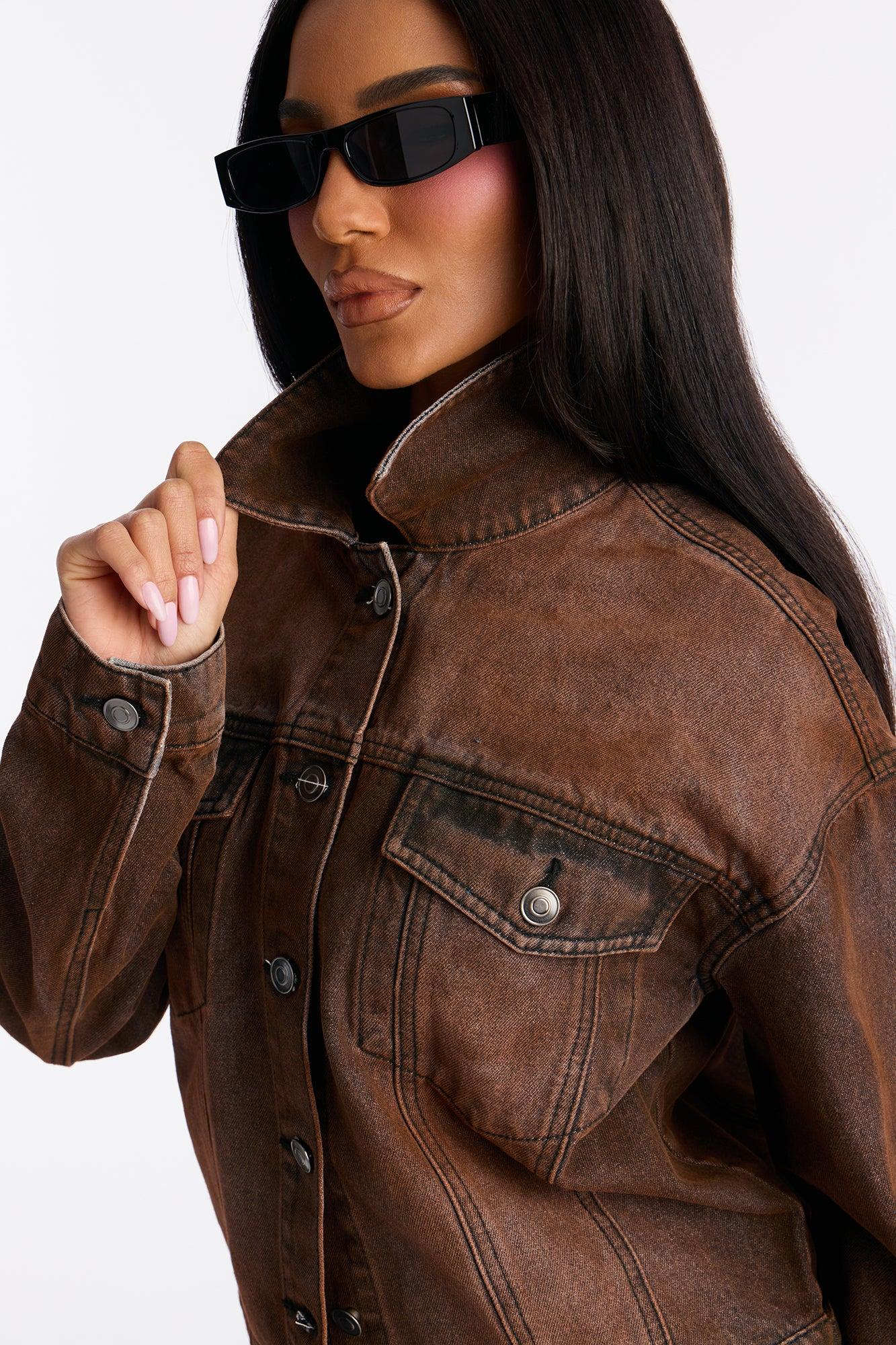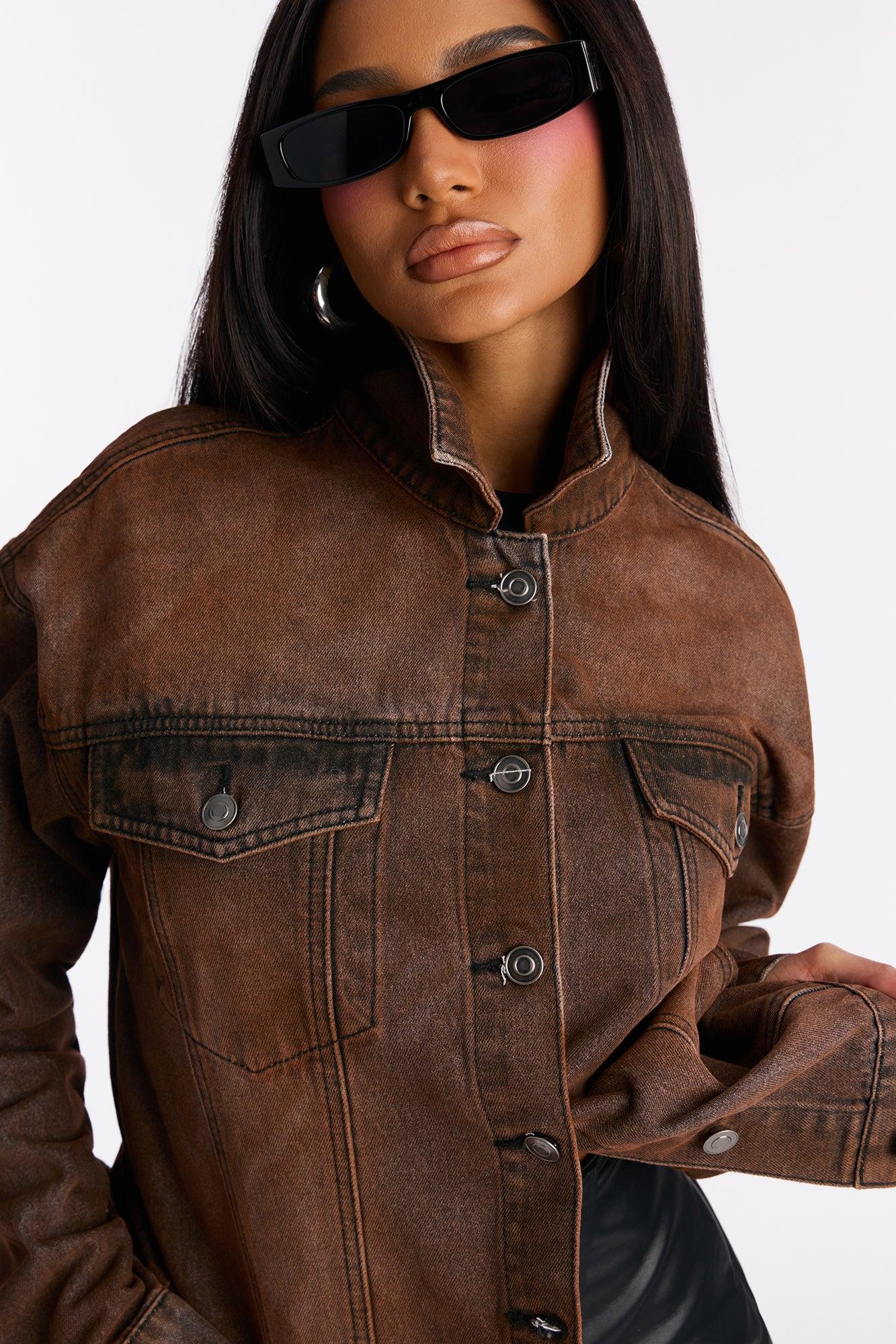 Available In Brown. Denim Jacket Coated Collar Button Closure Front Pockets Non Stretch Disclaimer: Due To The Specialized Wash, Each Garment Is Unique. 75% Cotton 15% Viscose 10% Polyester Imported California Proposition 65WARNING: Cancer and Reproductive Harm - www.P65Warnings.ca.gov.