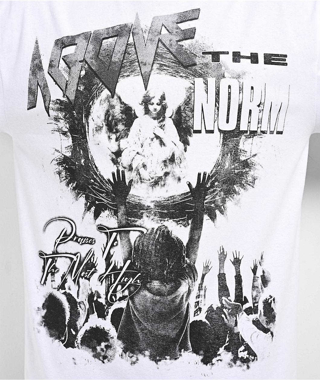 From the brand's "Sent From Above" capsule, the Above The Norm Most High t-shirt arrives in a crisp white colorway; with a playful twist on classic concert tees. The chest features a crowd gathered before a heavenly portal, with "Praises to the most