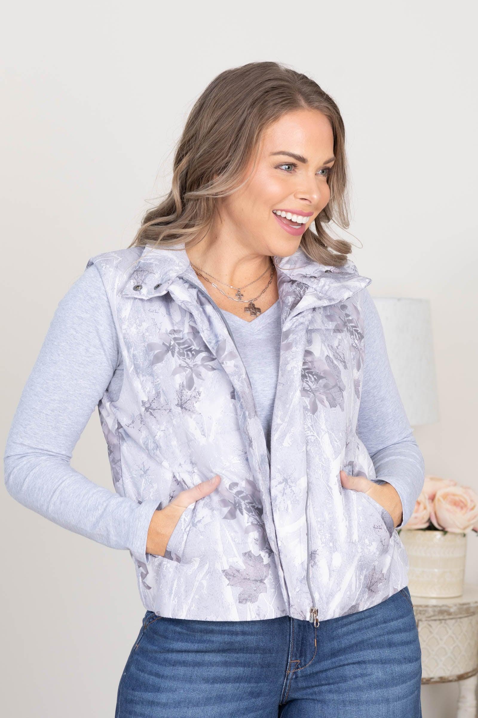 Product Details Colors: Dusty Pink, Mocha, Olive, White/ Gray, Mocha, White Print: Camo Neckline: Zip Up Sleeve: Sleeveless Hemline: Straight Material and Care Shell: 100% Polyester Lining: 100% Polyester Filling: 100% Polyester Machine Wash Cold Tumble Dry Low Size and Fit Small: Bust 40" Waist 40" Length 22" Medium: Bust 42" Waist 42" Length 22.5" Large: Bust 44" Waist 44" Length 23" X Large: Bust 46" Waist 46" Length 23.5" Erica is 5’7” and wearing her true size small