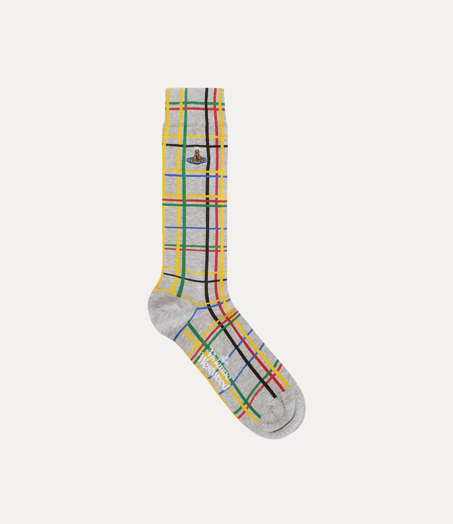 Our socks feature this season's 'Abstract Check' motif across the design, complete with playful tones that evoke the blocky geometry of Piet Mondrian. The piece offers the house's iconic orb motif at the side, recalling Vivienne's vision of taking tradition into the future.