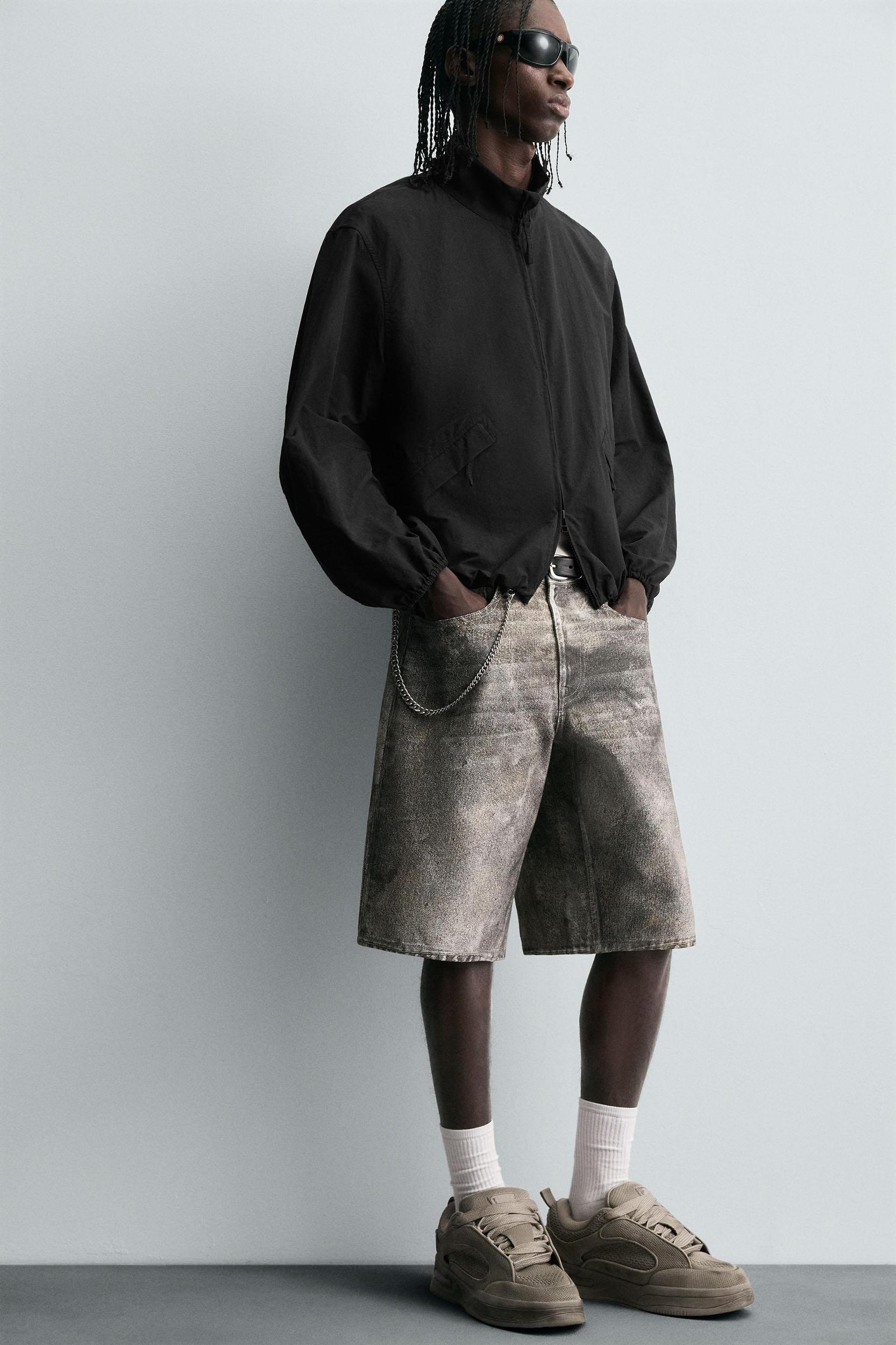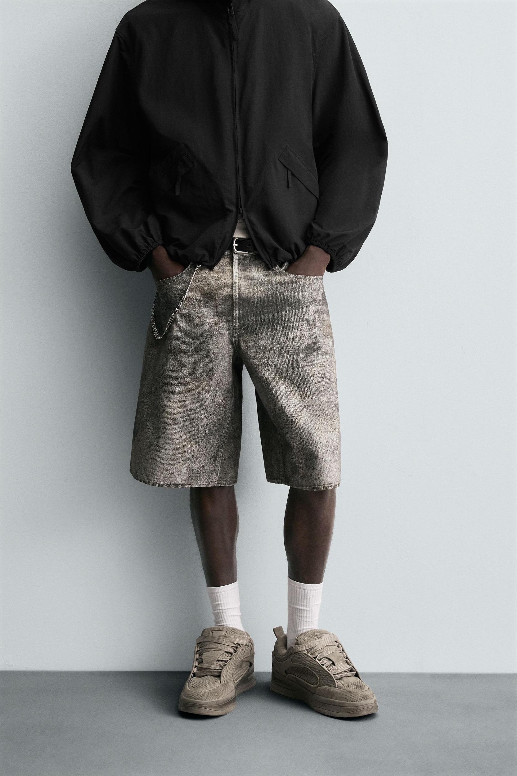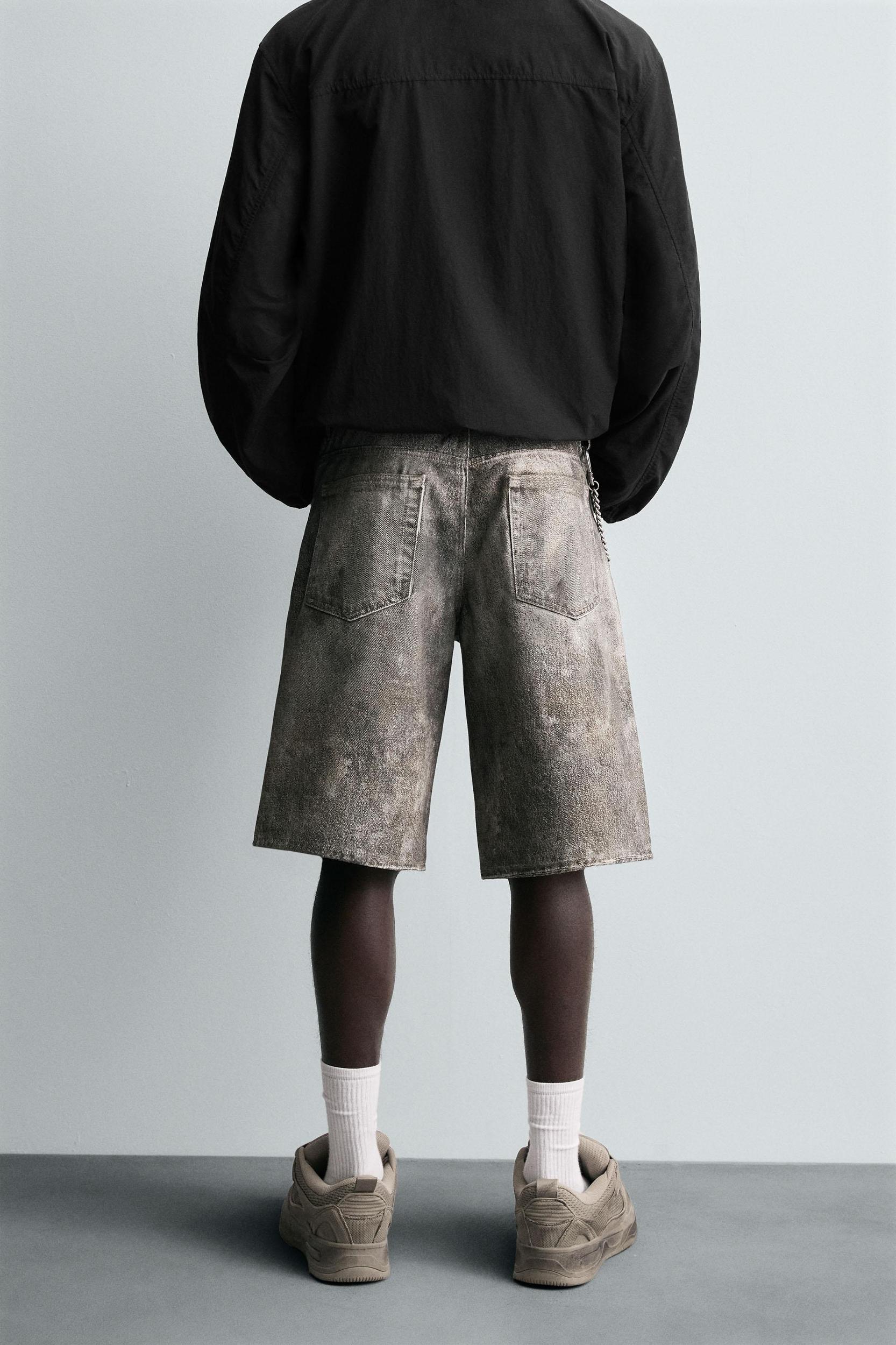 Baggy fit Bermuda shorts made of cotton denim. Five pockets. Washed effect. Front zip and button closure.