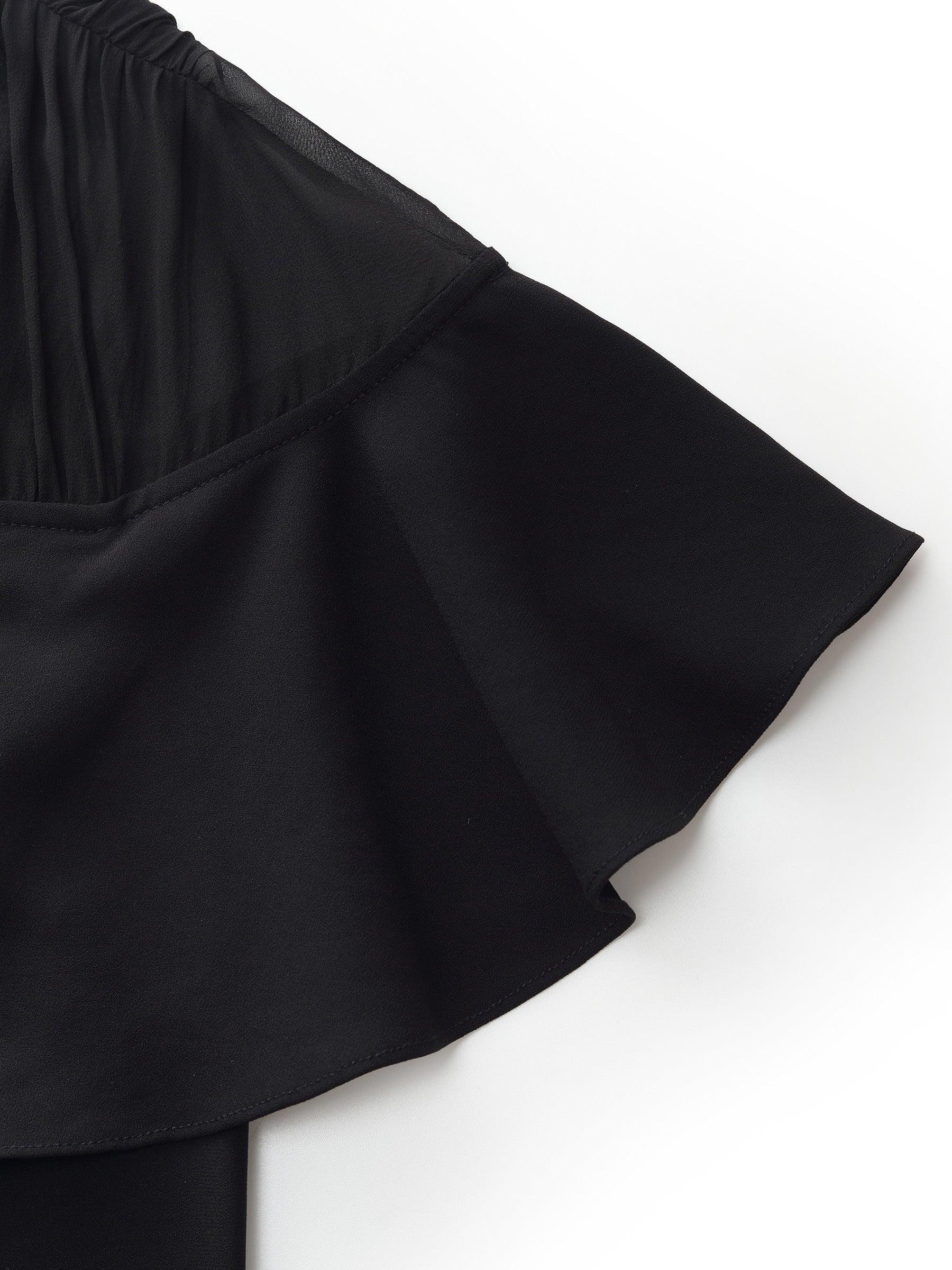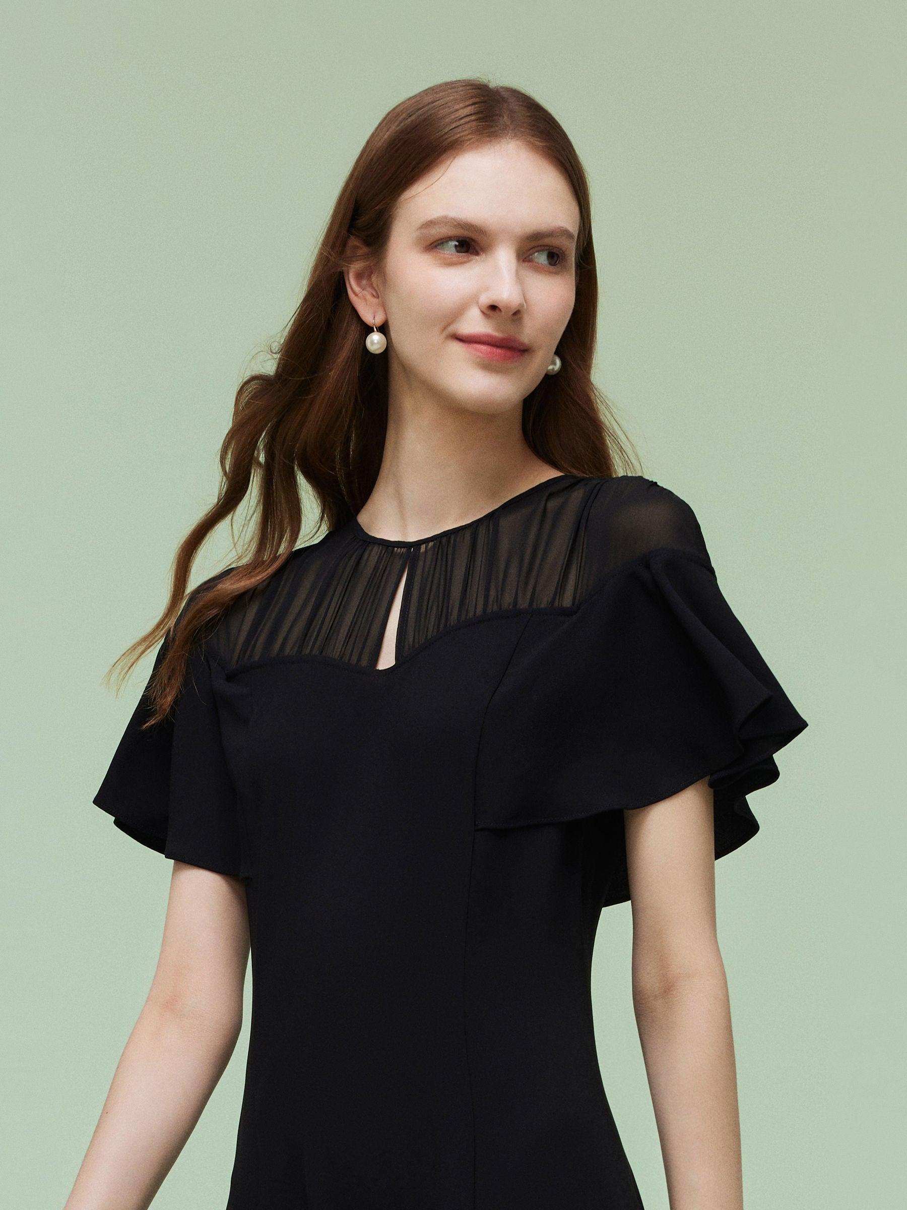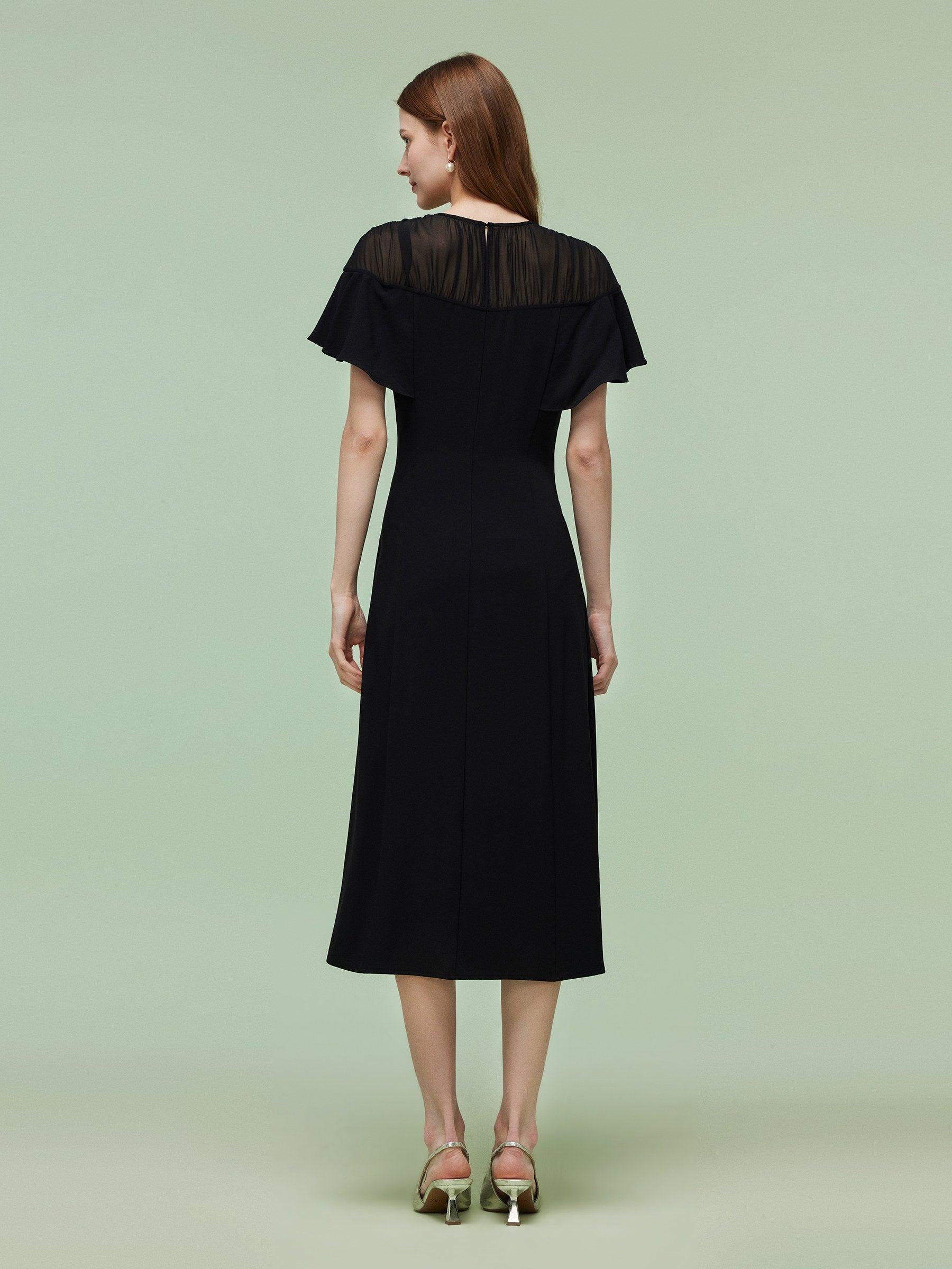 -Acetate blend fabric -10MM Mulberry silk patchwork sheer shoulder -Ruffle-sleeved design Blending an acetate blend main body and a sheer 10MM Mulberry Silk shoulder, this midi dress offers a perfect balance of sophistication and comfort. The sheer mesh shoulder adds depth, while the ruffled sleeves infuse a romantic f