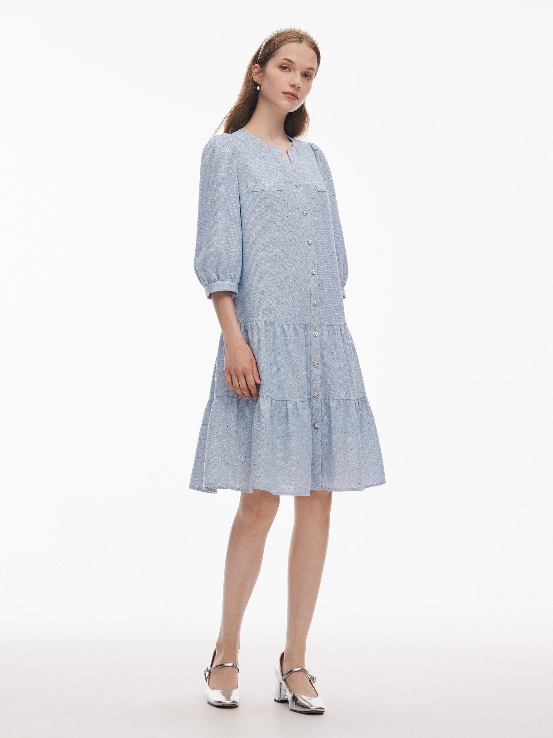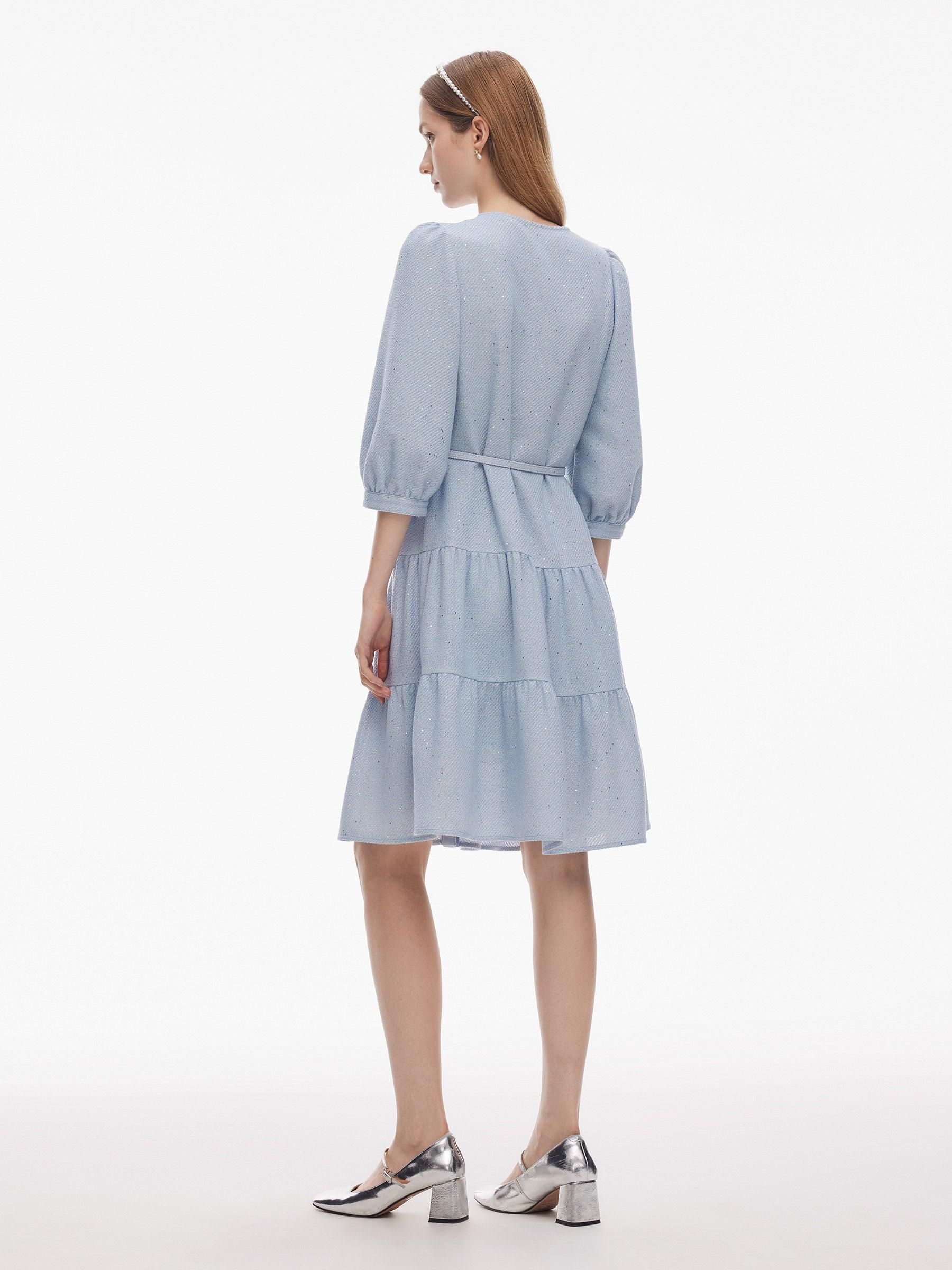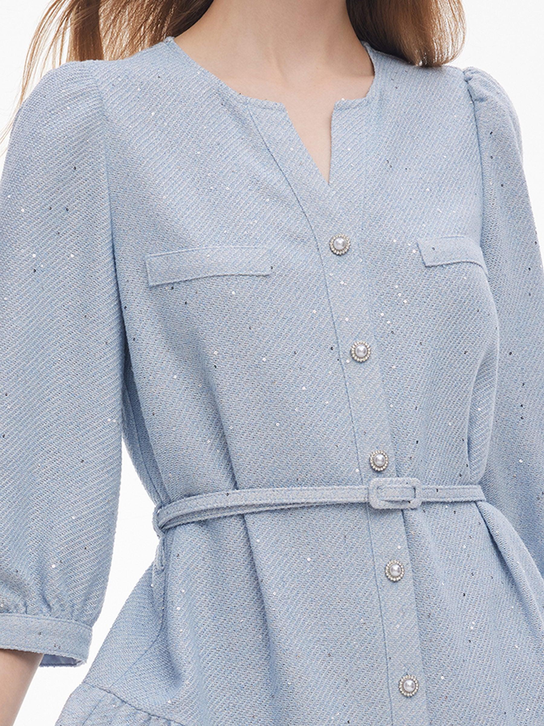 -Acetate blend tweed fabric -With belt -With sequins This refined tweed midi dress highlights the textured charm of an acetate blend tweed fabric, with a tiered skirt and adjustable belt loops on both sides. It is also designed with a v-neckline for style, an included belt for versatility, as well as a button placket f