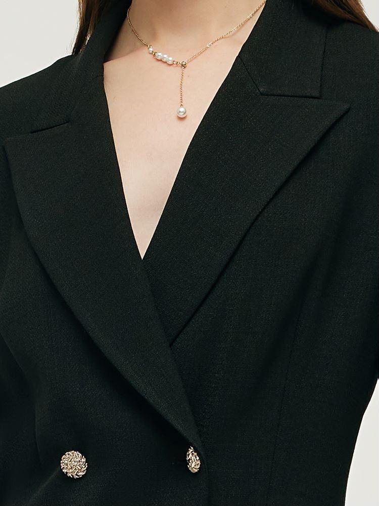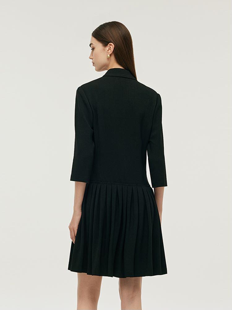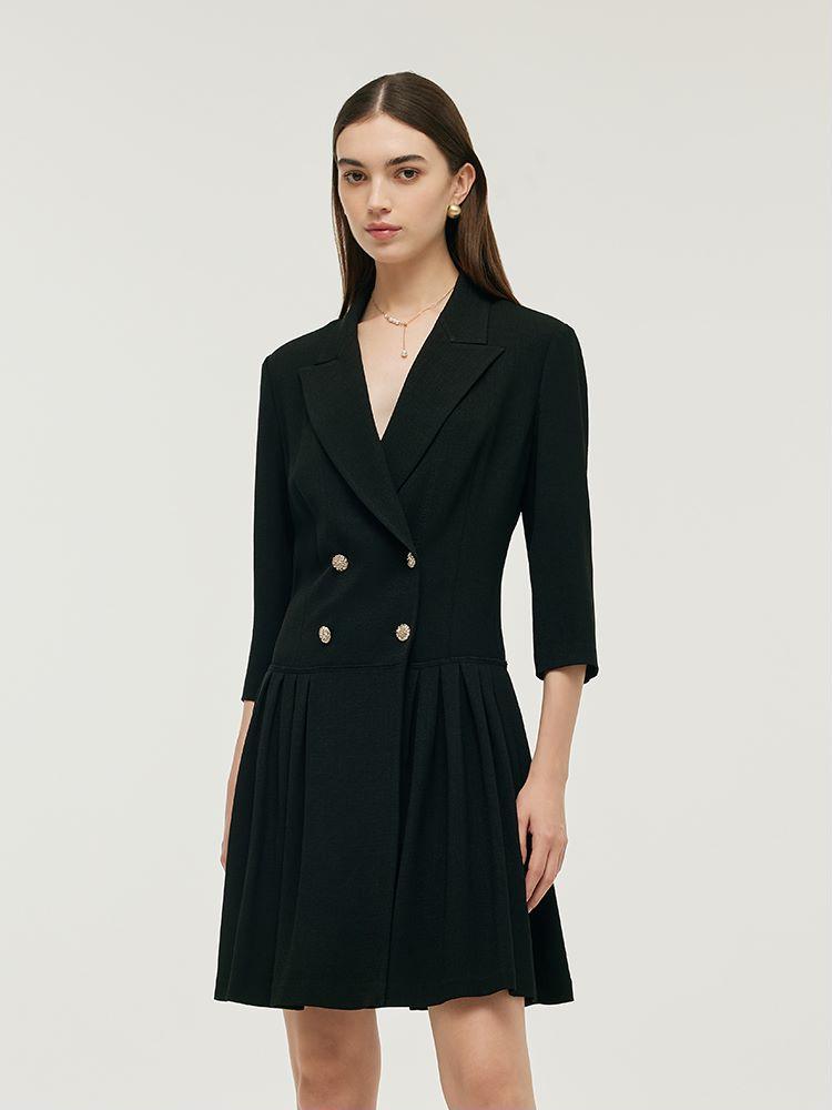 -Acetate fabric -V-neck design -Workwear Elegant and sophisticated, this premium acetate dress merges a V-neck with a classic double-breasted blazer silhouette, perfect for formal events. Its pleated skirt adds a touch of femininity. The subtle textured metal buttons ensure a harmonious finish. A timeless fashion state