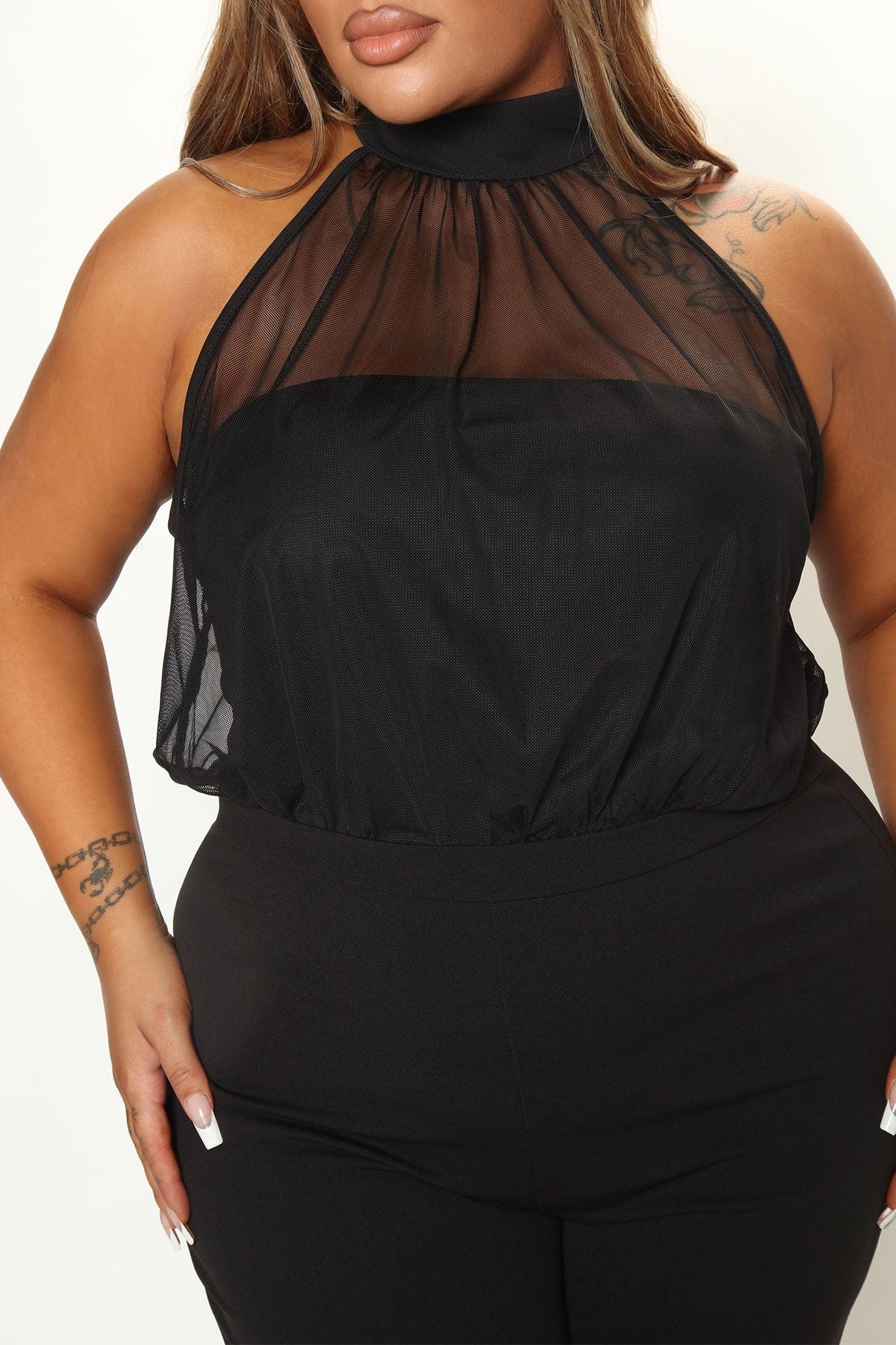 Available In Black. Jumpsuit Mock Neck Mesh Top Detail No Zipper Back Button Closure Stretch Wide Leg 34" Inseam Shell/Contrast: 95% Polyester 5% Spandex Imported California Proposition 65WARNING: Cancer and Reproductive Harm - www.P65Warnings.ca.gov.