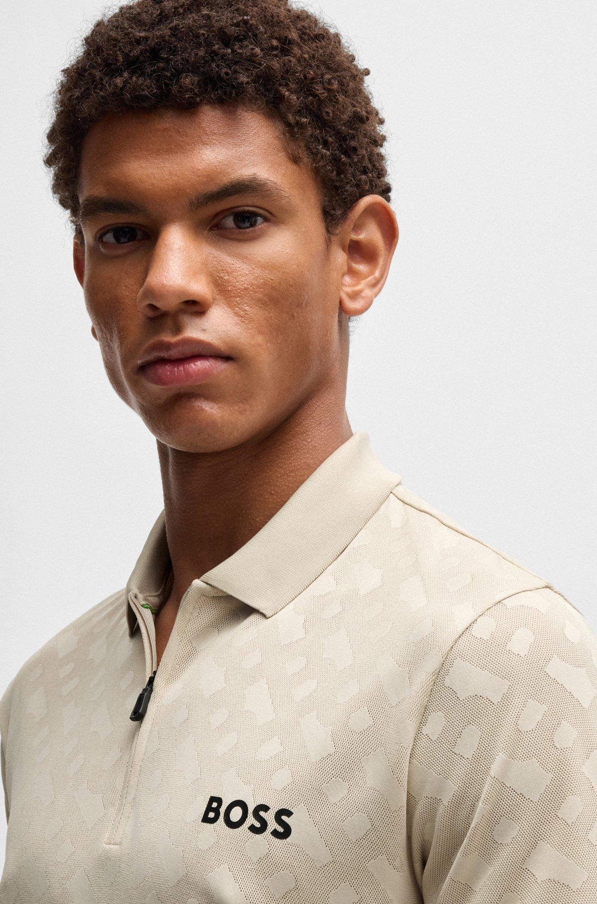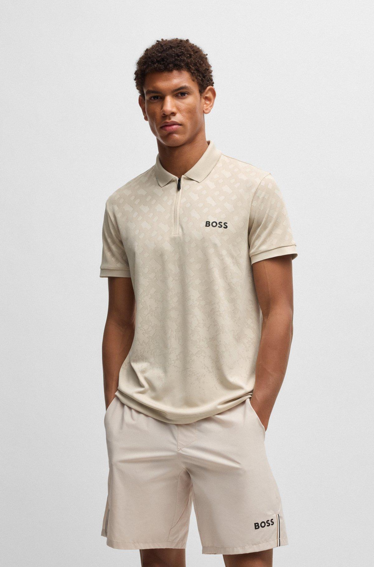 With four-way stretch and moisture management, this slim-fit BOSS Menswear polo offers advanced performance and lasting freshness. Clean zip placket. Tonal monogram jacquard.