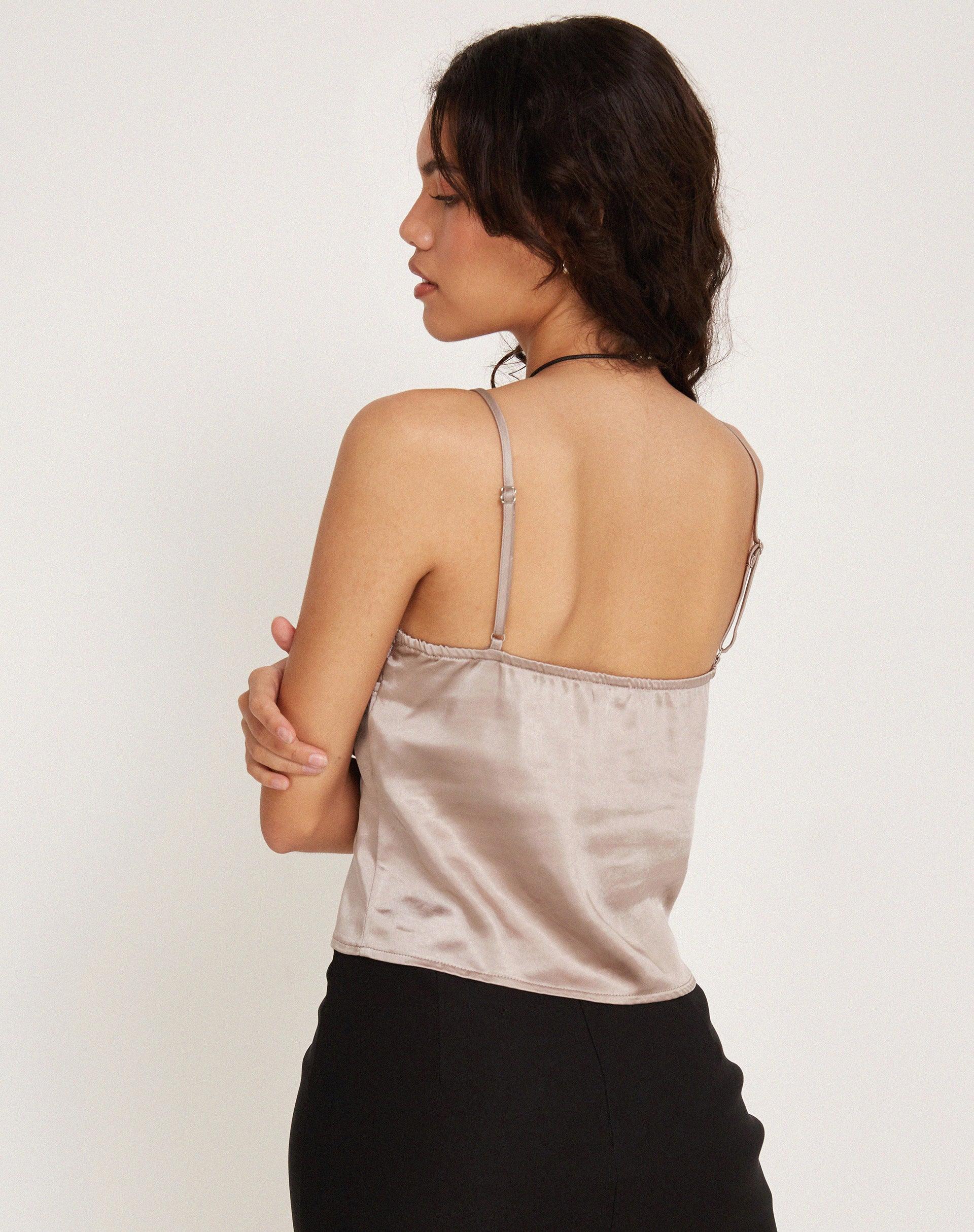 Turn heads in our Adalia top. In a champagne heavy satin fabric, it features a loose, cropped fit with cami straps and a V neckline. Detailed with a lace trim and tie straps centre front. MODEL WEARS SIZE:EXTRA SMALL - MODEL HEIGHT:5'7 - FABRIC CONTENT: 96% POLYESTER 4% ELASTANE