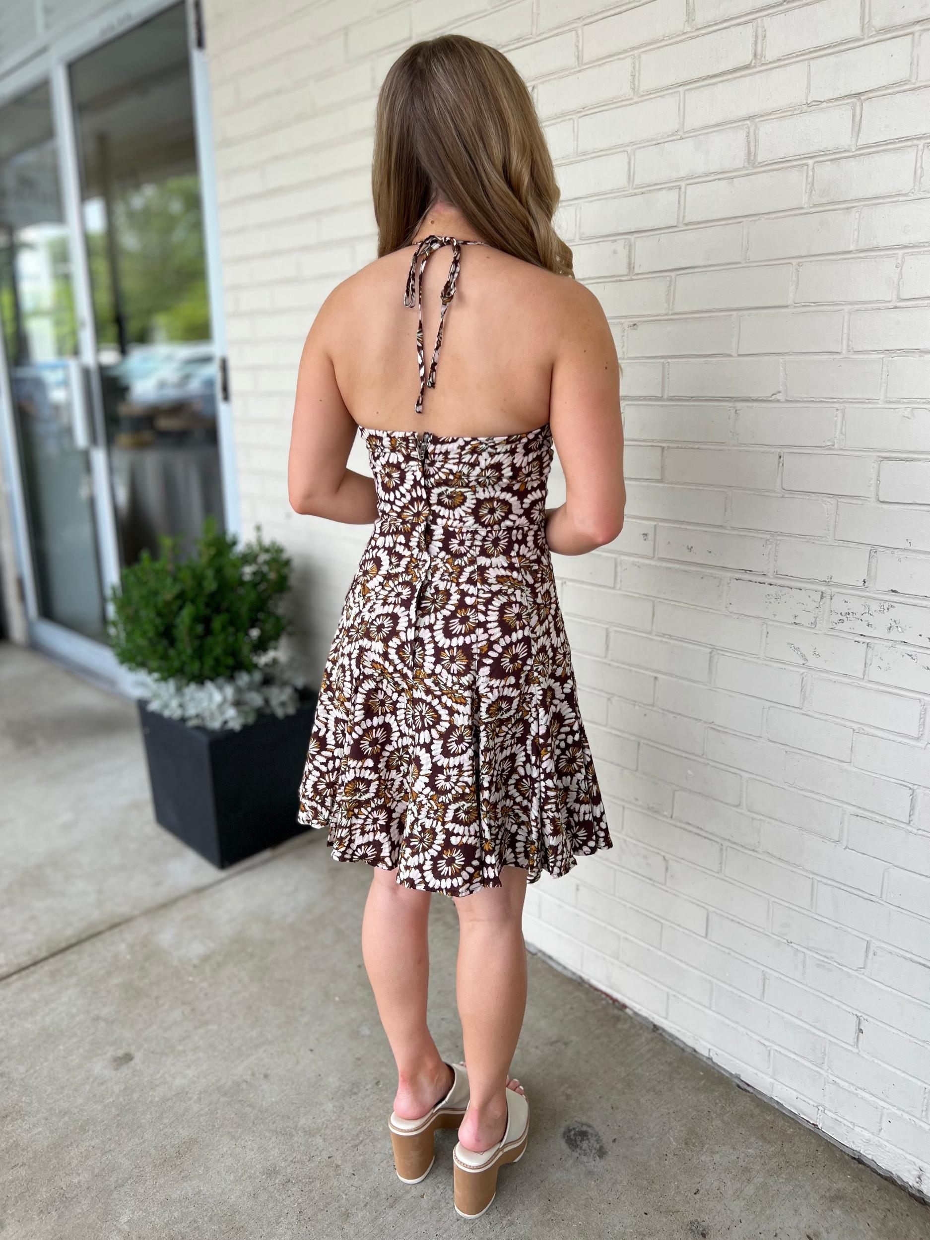 The Adaline Dress brings a playful twist to floral elegance with its vibrant brown, pink, green, orange, and cream pattern. Featuring a pleated skirt and a tie halter neck, it offers a flirty silhouette that’s perfect for sunny days. The visible cups add a touch of bold charm, making this dress a fun and stylish choice for any casual outing or garden party.