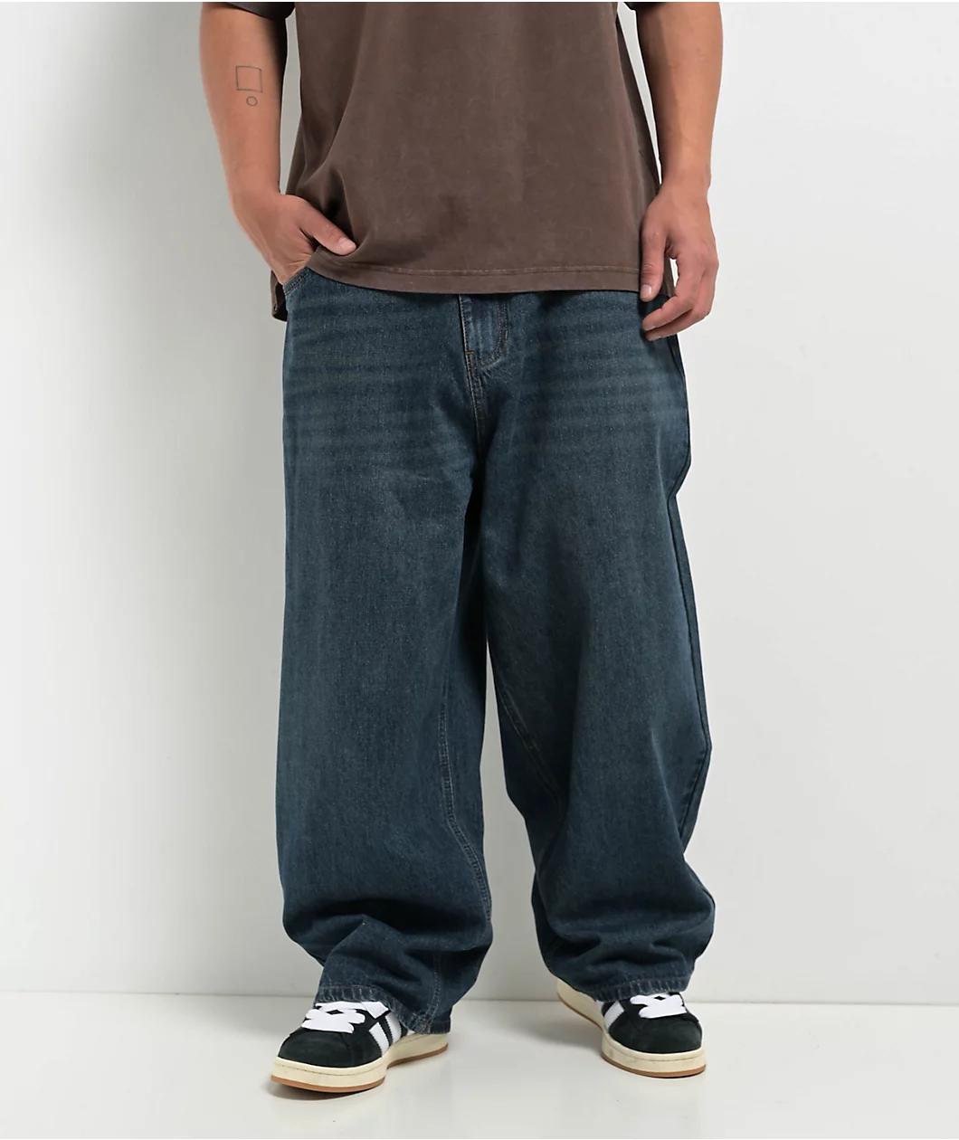 Born from classically oversized flowy silhouettes from the late 90s and early 00s, Adam Bomb introduces baggy denim jeans in a special dark blue wash for a vintage look. The ultra-loose pants feature a standard five-pocket configuration, an embossed