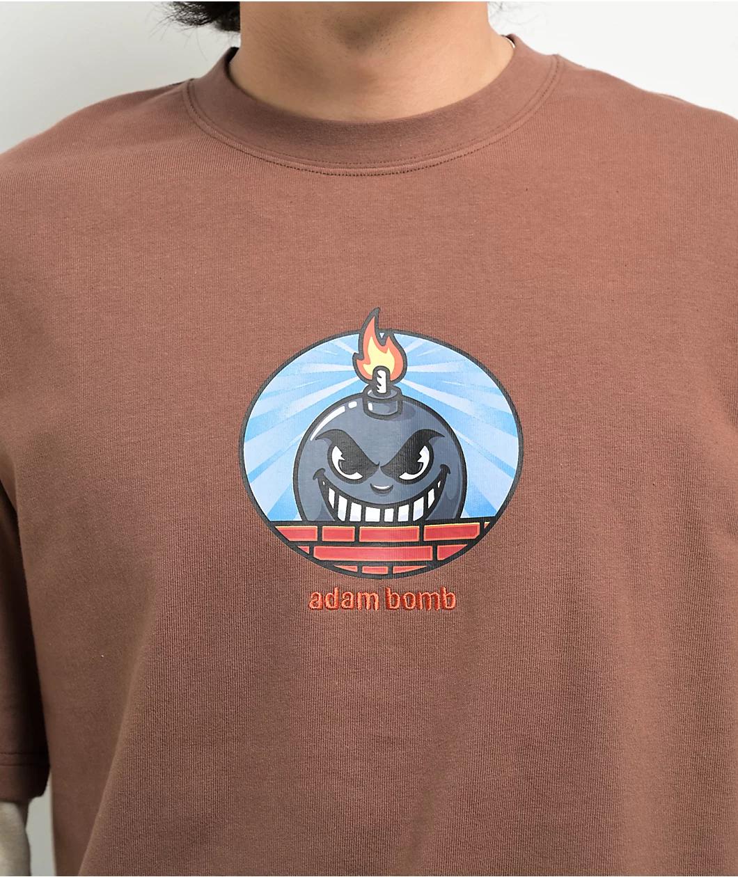 Adam Bomb presents the brown 2fer t-shirt, perfect for those looking to add a layered look to a casual outfit. The long sleeves are a beige color, contrasting nicely against the brown body. A screen printed graphic of an angry bomb above embroidered