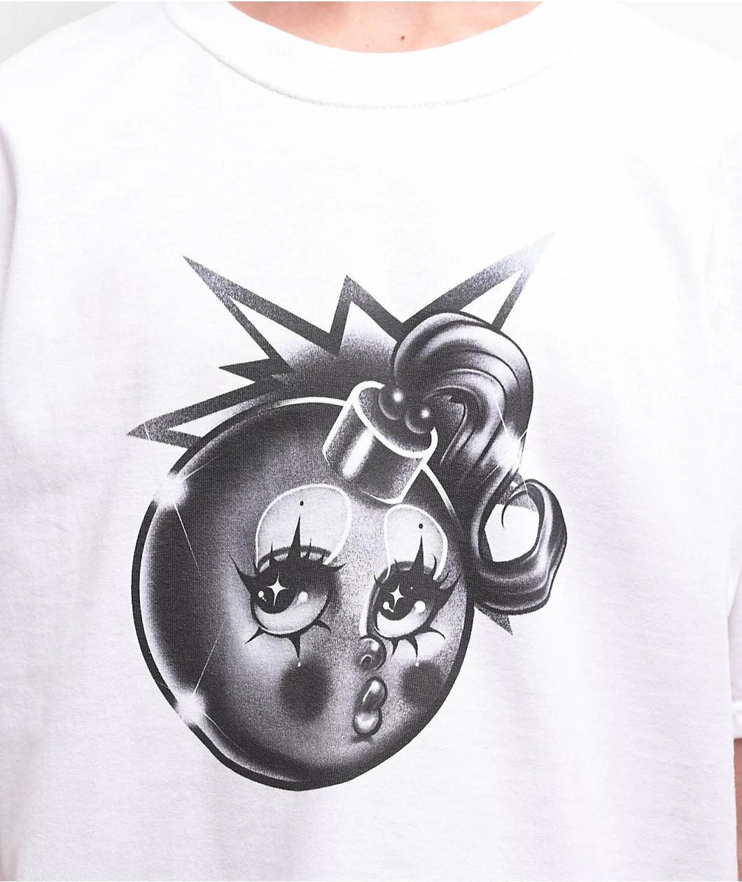 The minds at Adam Bomb welcome the Gigglez Bomb t-shirt in a clean white colorway. Printed on the front of the graphic tee is an airbrushed-themed kissing face Bomb logo with the wick replaced with a ponytail for a humorous vibe. This shirt comes fin