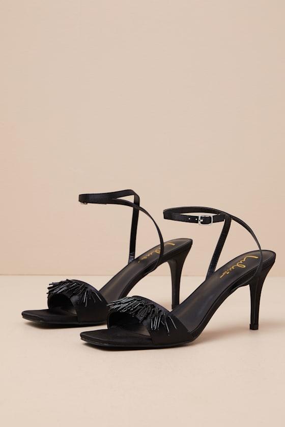 Designed for nights to remember, these sleek satin heels have a modern square footbed and a slender toe strap that boasts layers of shiny black beads for a fringe effect. An ankle strap sprouts from the sides and secures with a silver buckle, all atop a sexy stiletto heel.