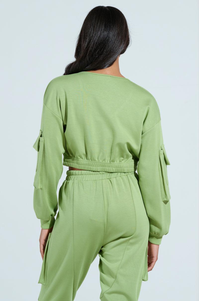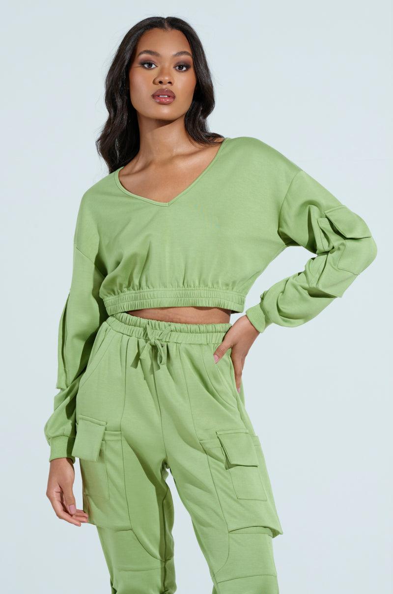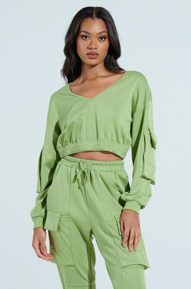 Onlookers will be green with envy when they see how cute and comfy you look in The AKIRA Label Addicted To You Sweatshirt! Crafted from a stretchy, irresistibly soft fabrication, this pull-over features a cropped, relaxed fit, a V-neckline, a cinched, elasticized hem, and long sleeves with ribbed cuffs and spacious cargo pockets on each elbow complete with velcro fastenings. Style it with the Addicted To You Jogger for a casual, coordinated look. - 50% Viscose, 45% Polyester, 5% Spandex- Stretchy- Imported (all measurements approximate from size small)- 17” Shoulder to Hem- 23” Shoulder to Shoulder- 21” Sleeves- Model is 5’8” and wearing a size smallProduct ID: 471031