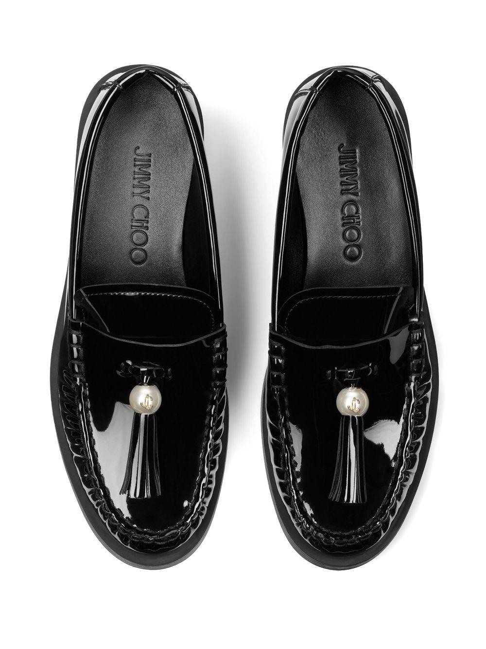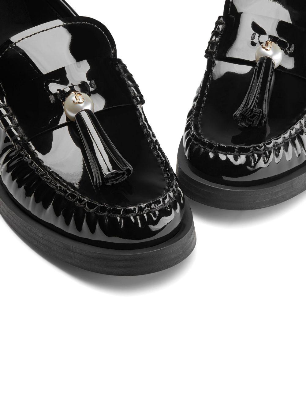 Jimmy Choo Addie pearl-embellished leather loafers | Black | black | leather | patent finish | faux-pearl embellishment | tassel detail | almond toe | slip-on style | branded leather insole | low stacked heel | rubber sole | Wardrobe Icon | Leather | Loafers | Shoes | Women