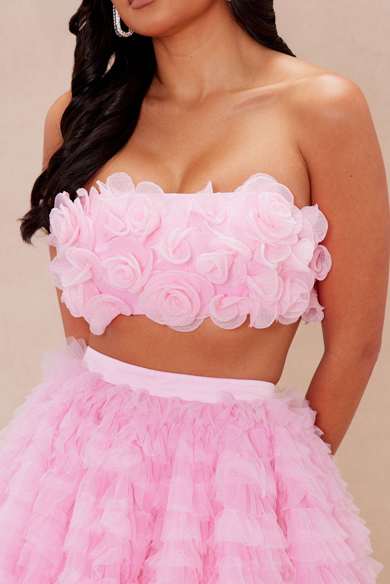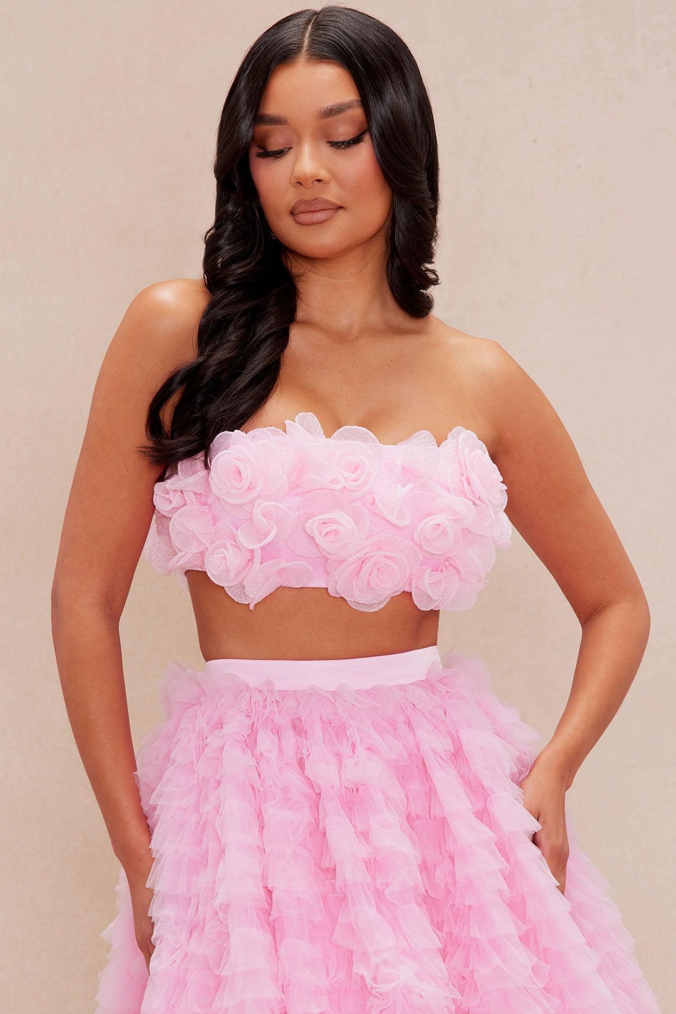 Available In Chocolate And Pink. Floral Applique Bandeau Top Straight Neckline Padded Bra Cups Strapless Grip Tape Boning Tiered, Tulle A Line Skirt Back Zipper Closure Lined Non Stretch Top: 100% Polyester Skirt: Shell: 100% Polyester Lining: 100% Polyester Imported