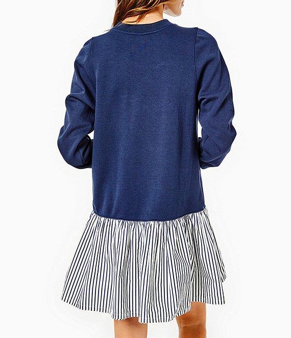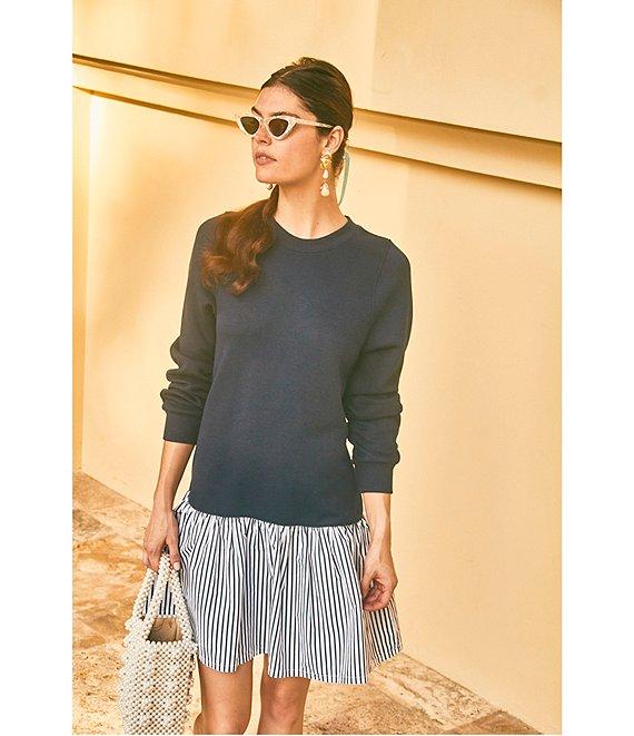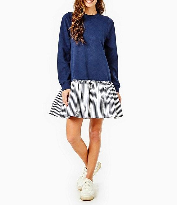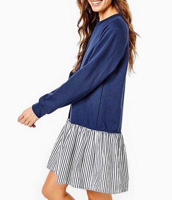From Addison Bay, this dress features: Sweatshirt dress Drop waist silhouette Crew neckline Long sleeves Peplum hem Above the knee Pullover approx. 35" in length Cotton/rayon/polyester blend with cotton poplin hem Machine wash cold/tumble dry Imported.
