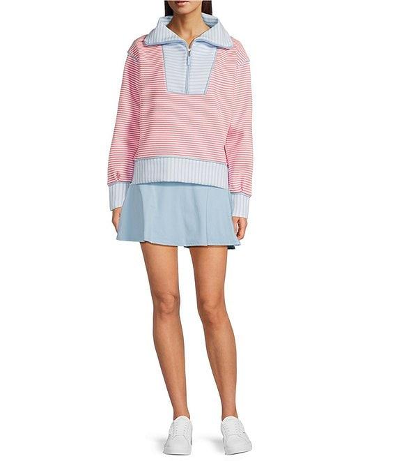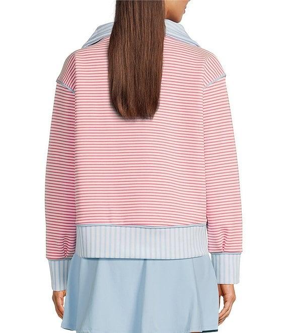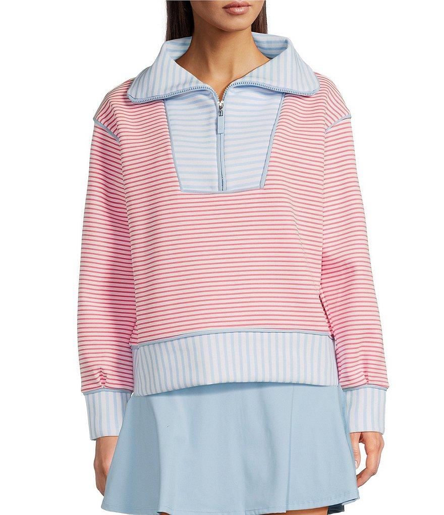 From Addison Bay, this sweatshirt features: Stripe print V-neckline Quarter-zip closure Long sleeve Pullover construction Approx. 25" Polyester/spandex Machine washable Imported.