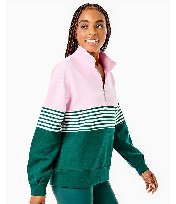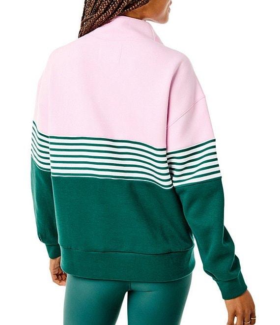 From Addison Bay, this pullover features: Knit Fabrication Stripe Colorblock Stand Mock Neckline Dropped Shoulder Long Sleeves Relaxed Fit Straight Hemline Mid Length Quarter Zip Front Closure Pullover Construction Approx. 24" in Length Cotton, Rayon, Polyester Machine wash on cold, tumble dry on low Imported.