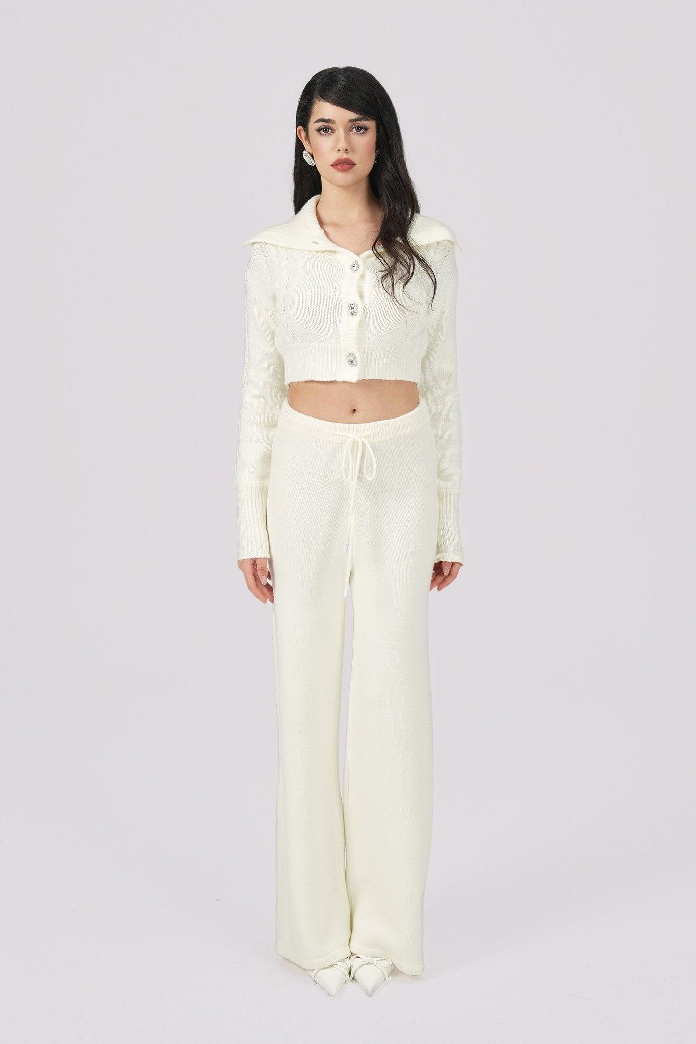 The Addison Wide-Leg Pants redefine elegance with comfort, crafted from soft and elastic 4.5-count Icelandic yarn that feels as light and warm as a gentle cloud. Featuring a thoughtfully designed elastic waistband with an adjustable knit drawstring, these pants offer a perfect fit and a touch of casual sophistication. The drawstring is adorned with color-matched painted pendants that sway gracefully, adding an exquisite charm to the design. With a flowing drape that smooths and elongates the leg line, these pants exude a relaxed yet refined confidence. Available in black, white, and pink, they effortlessly adapt to any style, whether calm and elegant, fresh and soft, or sweet and romantic. Features: Material: Woven with 4.5-count Icelandic yarn for a soft, light, and elastic feel. Waistband: Elastic waistband with an adjustable knit drawstring for a custom fit and added comfort. Details: Painted pendants on the drawstring add a delicate and unique touch. Fit: Wide-leg silhouette with natural draping that flatters and elongates the leg shape. Colors: Available in versatile black, white, and pink to suit any aesthetic. Styling: Perfect for creating a casual yet sophisticated look, easily paired with matching tops or other wardrobe staples.