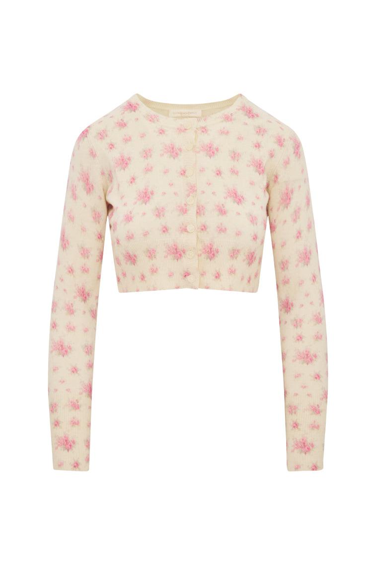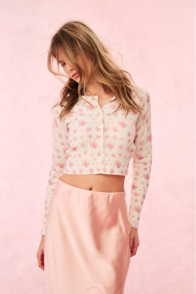 Living in the Adeanne Cardigan. This cute knit is designed from wool, giving it an extra warm and cozy feel. The sweater features our Pasadena Rose print all over for a playful touch. Self-covered buttons line center front. Self-covered buttons