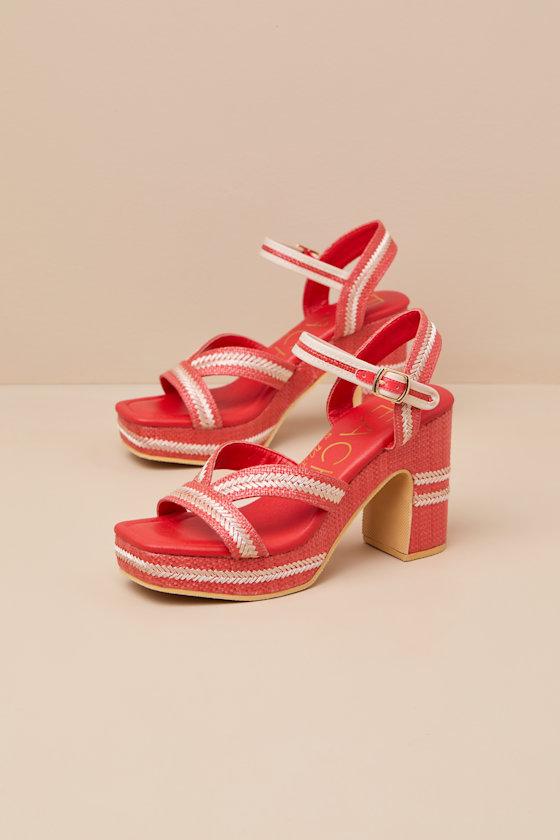 The Beach by Matisse Adelaide Red Raffia Embroidered Platform Ankle Strap Sandals can't wait to step out for a picture-perfect day with you! Boho-chic woven raffia shapes these summery platforms with a squared footbed and a strappy upper. An adjustable quarter strap secures at the ankle with a gold buckle, all atop a sturdy block heel. Contrasting cream-hued embroidery (with a braided effect) and canvas detailing complete the sunny day design. Available in whole sizes only.